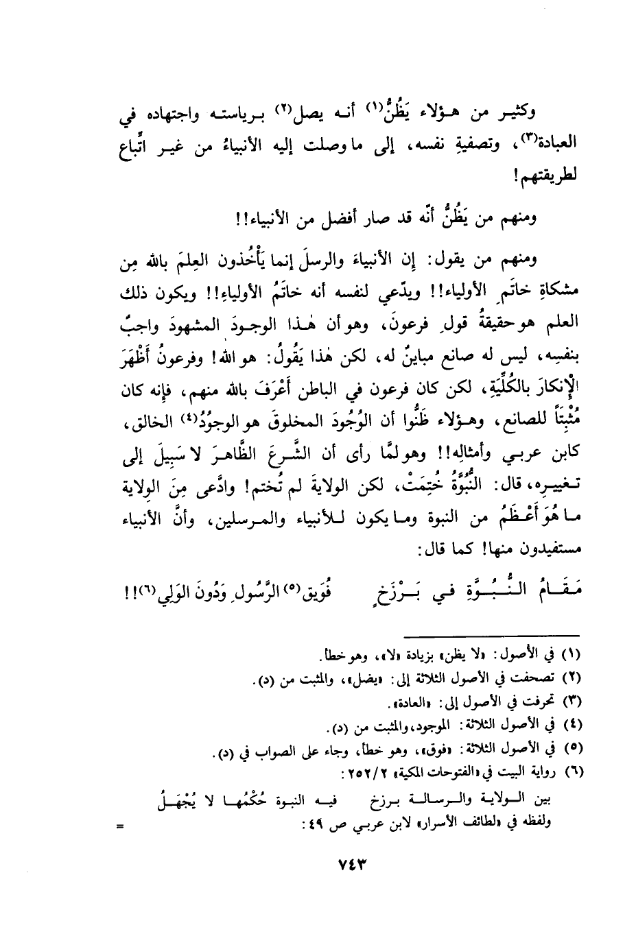 وَمِنْهُمْ مَنْ يَقُولُ إِنَّ الْأَنْبِيَاءَ وَالرُّسُلَ إِنَّمَا يَأْخُذُونَ الْعِلْمَ بِاللَّهِ مِنْ مِشْكَاةِ خَاتَمِ الْأَوْلِيَاءِ! ! وَيَدَّعِي لِنَفْسِهِ أَنَّهُ خَاتَمُ الْأَوْلِيَاءِ! ! وَيَكُونُ ذَلِكَ الْعِلْمُ هُوَ حَقِيقَةُ قَوْلِ فِرْعَوْنَ، وَهُوَ أَنَّ هَذَا الْوُجُودَ الْمَشْهُودَ وَاجِبٌ بِنَفْسِهِ، لَيْسَ لَهُ صَانِعٌ مُبَايِنٌ لَهُ، لَكِنَّ هَذَا يَقُولُ: هُوَ اللَّهُ! وَفِرْعَوْنُ أَظْهَرَ الْإِنْكَارَ بِالْكُلِّيَّةِ، لَكِنْ كَانَ فِرْعَوْنُ فِي الْبَاطِنِ أَعْرَفُ بِاللَّهِ مِنْهُمْ، فَإِنَّهُ كَانَ مُثْبِتًا لِلصَّانِعِ، وَهَؤُلَاءِ ظَنُّوا أَنَّ الْوُجُودَ الْمَخْلُوقَ هُوَ الْوُجُودُ الْخَالِقُ، كَابْنِ عَرَبِيٍّ وَأَمْثَالِهِ! ! وَهُوَ لَمَّا رَأَى أَنَّ الشَّرْعَ الظَّاهِرَ لَا سَبِيلَ إِلَى تَغْيِيرِهِ - قَالَ: النُّبُوَّةُ خُتِمَتْ، لَكِنَّ الْوِلَايَةَ لَمْ تُخْتَمْ! وَادَّعَى مِنَ الْوِلَايَةِ مَا هُوَ أَعْظَمُ مِنَ النُّبُوَّةِ وَمَا يَكُونُ لِلْأَنْبِيَاءِ وَالْمُرْسَلِينَ، وَأَنَّ الْأَنْبِيَاءَ مُسْتَفِيدُونَ مِنْهَا! كَمَا قَالَ: