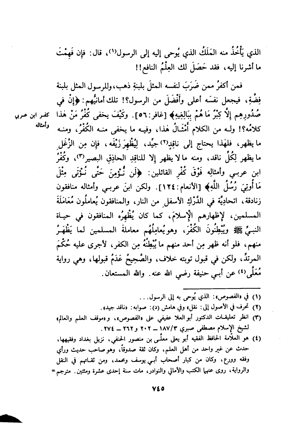 فَمَنْ أَكْفُرُ مِمَّنْ ضَرَبَ لِنَفْسِهِ الْمَثَلَ بِلَبِنَةِ ذَهَبٍ، وَلِلرُّسُلِ الْمَثَلَ بِلَبِنَةِ فِضَّةٍ، فَيَجْعَلُ نَفْسَهُ أَعْلَى وَأَفْضَلَ مِنَ الرُّسُلِ؟ ! تِلْكَ أَمَانِيُّهُمْ: {إِنْ فِي صُدُورِهِمْ إِلَّا كِبْرٌ مَا هُمْ بِبَالِغِيهِ} [غَافِرٍ: 56] . وَكَيْفَ يَخْفَى كُفْرُ مَنْ هَذَا كَلَامُهُ؟ وَلَهُ مِنَ الْكَلَامِ أَمْثَالُ هَذَا، وَفِيهِ مَا يَخْفَى مِنْهُ الْكُفْرُ، وَمِنْهُ مَا يَظْهَرُ، فَلِهَذَا يَحْتَاجُ إِلَى نَاقِدٍ جَيِّدٍ، لِيُظْهِرَ زَيْفَهُ، فَإِنَّ مِنَ الزَّغَلِ مَا يَظْهَرُ لِكُلِّ نَاقِدٍ، وَمِنْهُ مَا لَا يَظْهَرُ إِلَّا لِلنَّاقِدِ الْحَاذِقِ الْبَصِيرِ. وَكُفْرُ ابْنُ عَرَبِيٍّ وَأَمْثَالُهُ فَوْقَ كُفْرِ الْقَائِلِينَ: {لَنْ نُؤْمِنَ حَتَّى نُؤْتَى مِثْلَ مَا أُوتِيَ رُسُلُ اللَّهِ} [الْأَنْعَامِ: 124] . وَلَكِنَّ ابْنَ عَرَبِيٍّ وَأَمْثَالَهُ مُنَافِقُونَ زَنَادِقَةٌ، اتِّحَادِيَّةٌ فِي الدَّرْكِ الْأَسْفَلِ مِنَ النَّارِ، وَالْمُنَافِقُونَ يُعَامَلُونَ مُعَامَلَةَ الْمُسْلِمِينَ، لِإِظْهَارِهِمُ الْإِسْلَامَ، كَمَا كَانَ يُظْهِرُهُ الْمُنَافِقُونَ فِي حَيَاةِ النَّبِيِّ صَلَّى اللَّهُ عَلَيْهِ وَسَلَّمَ وَيُبْطِنُونَ الْكُفْرَ، وَهُوَ يُعَامِلُهُمْ مُعَامَلَةَ الْمُسْلِمِينَ لِمَا يَظْهَرُ مِنْهُمْ. فَلَوْ أَنَّهُ ظَهَرَ مِنْ أَحَدٍ مِنْهُمْ مَا يُبْطِنُهُ مِنَ الْكُفْرِ، لَأَجْرَى عَلَيْهِ حُكْمَ الْمُرْتَدِّ. وَلَكِنْ فِي قَبُولِ تَوْبَتِهِ خِلَافٌ، وَالصَّحِيحُ عَدَمُ قَبُولِهَا، وَهِيَ رِوَايَةُ مُعَلَّى عَنْ أَبِي حَنِيفَةَ رَضِيَ اللَّهُ عَنْهُ. وَاللَّهُ الْمُسْتَعَانُ.