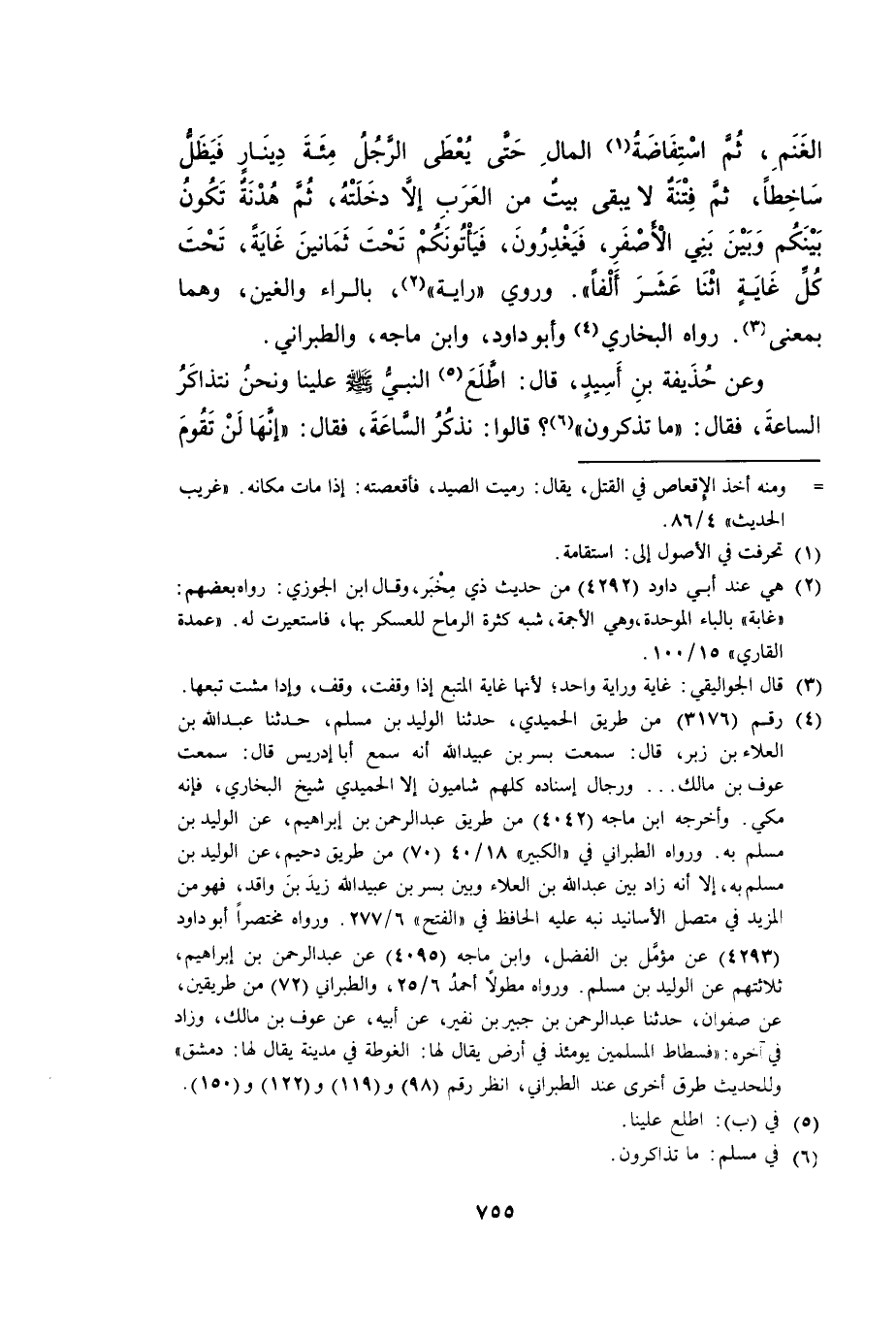 وَعَنْ حُذَيْفَةَ بْنِ أَسِيدٍ، قَالَ: «اطَّلَعَ النَّبِيُّ صَلَّى اللَّهُ عَلَيْهِ وَسَلَّمَ عَلَيْنَا وَنَحْنُ نَتَذَاكَرُ السَّاعَةَ، فَقَالَ: مَا تَذْكُرُونَ؟ قَالُوا: نَذْكُرُ السَّاعَةَ، فَقَالَ: إِنَّهَا لَنْ تَقُومَ
