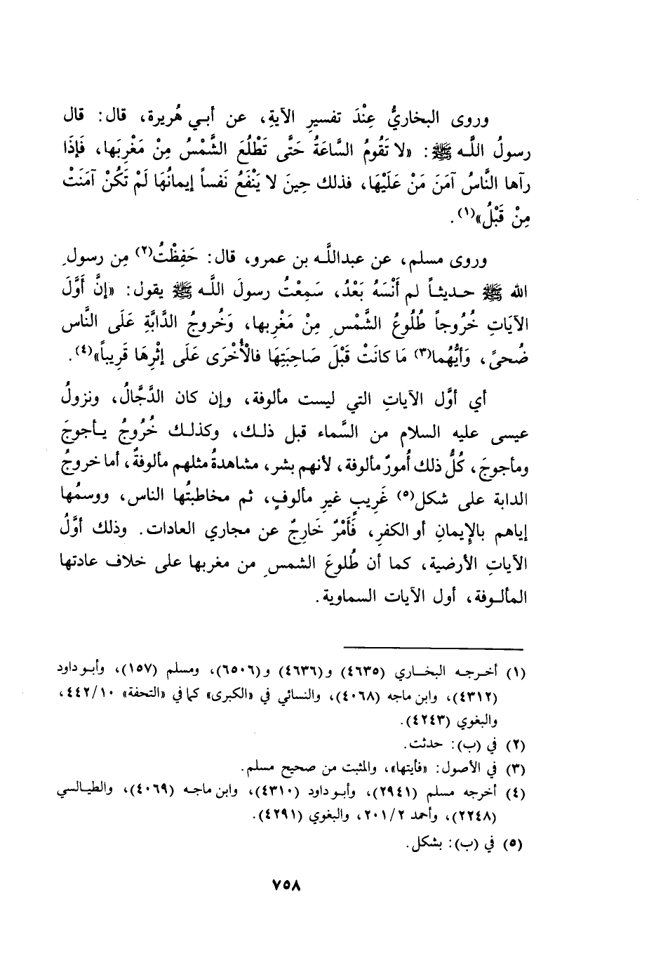 وَرَوَى مُسْلِمٌ، عَنْ عَبْدِ اللَّهِ بْنِ عَمْرٍو، قَالَ: «حَفِظْتُ مِنْ رَسُولِ اللَّهِ صَلَّى اللَّهُ عَلَيْهِ وَسَلَّمَ حَدِيثًا لَمْ أَنْسَهُ بَعْدُ، سَمِعْتُ رَسُولَ اللَّهِ صَلَّى اللَّهُ عَلَيْهِ وَسَلَّمَ يَقُولُ: إِنَّ أَوَّلَ الْآيَاتِ خُرُوجًا طُلُوعُ الشَّمْسِ مِنْ مَغْرِبِهَا، وَخُرُوجُ الدَّابَّةِ عَلَى النَّاسِ ضُحًى، وَأَيُّهُمَا مَا كَانَتْ قَبْلَ صَاحِبَتِهَا فَالْأُخْرَى عَلَى إِثْرِهَا قَرِيبًا» .