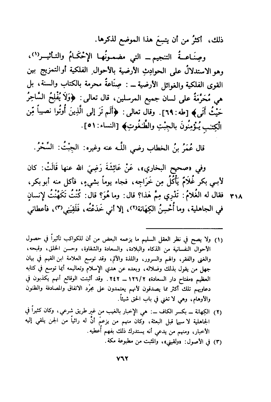 وَصِنَاعَةُ التَّنْجِيمِ، الَّتِي مَضْمُونُهَا الْإِحْكَامُ وَالتَّأْثِيرُ، وَهُوَ الِاسْتِدْلَالُ عَلَى الْحَوَادِثِ الْأَرْضِيَّةِ بِالْأَحْوَالِ الْفَلَكِيَّةِ أَوِ التَّمْزِيجُ بَيْنَ الْقُرَى الْفَلَكِيَّةِ وَالْغَوَائِلِ الْأَرْضِيَّةِ -: صِنَاعَةٌ مُحَرَّمَةٌ بِالْكِتَابِ وَالسُّنَّةِ، بَلْ هِيَ مُحَرَّمَةٌ عَلَى لِسَانِ جَمِيعِ الْمُرْسَلِينَ، قَالَ تَعَالَى: {وَلَا يُفْلِحُ السَّاحِرُ حَيْثُ أَتَى} [طه: 69] . وَقَالَ تَعَالَى: {أَلَمْ تَرَ إِلَى الَّذِينَ أُوتُوا نَصِيبًا مِنَ الْكِتَابِ يُؤْمِنُونَ بِالْجِبْتِ وَالطَّاغُوتِ} [النِّسَاءِ: 51] .