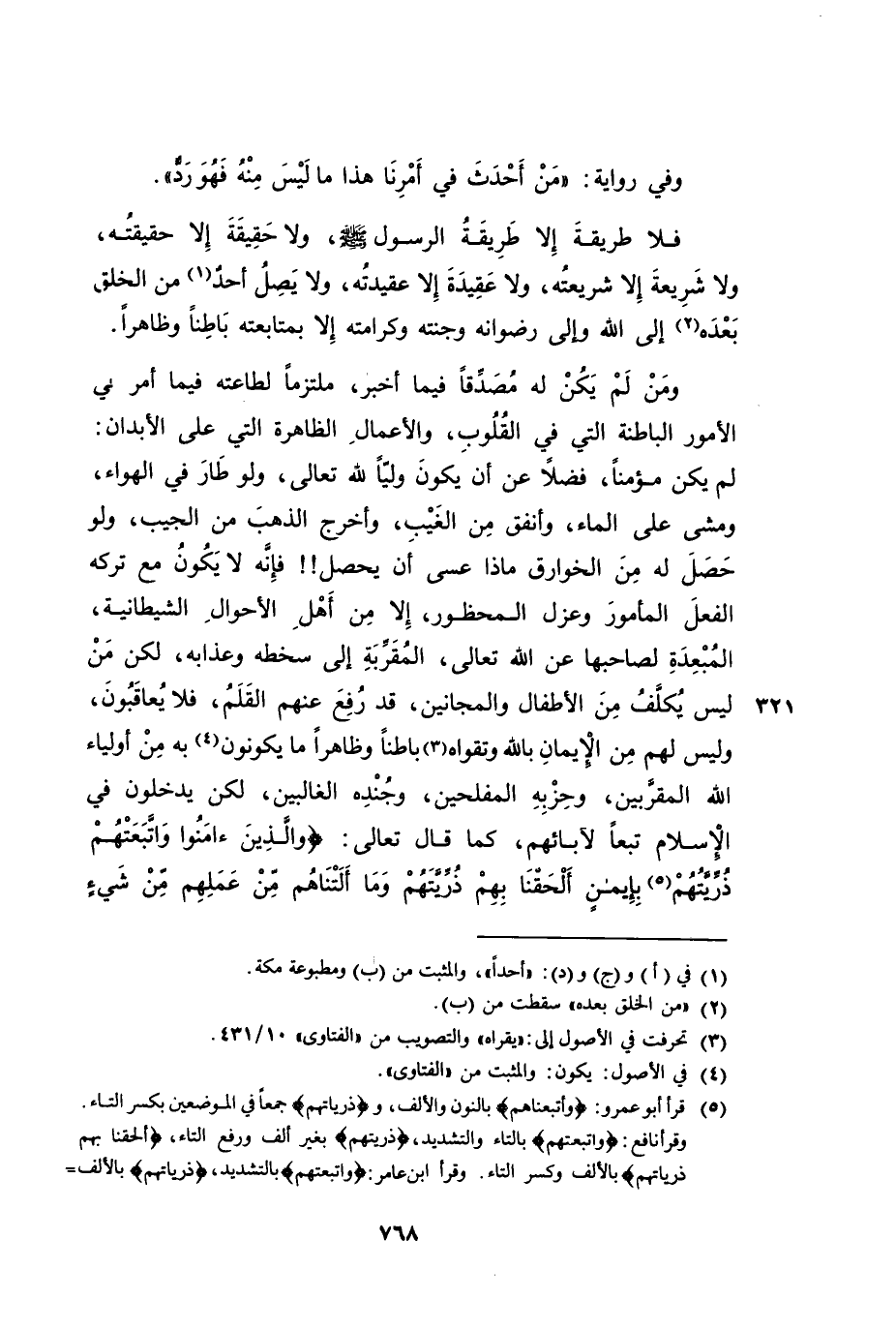 وَمَنْ لَمْ يَكُنْ لَهُ مُصَدِّقًا فِيمَا أَخْبَرَ، مُلْتَزِمًا لِطَاعَتِهِ فِيمَا أَمَرَ، فِي الْأُمُورِ الْبَاطِنَةِ الَّتِي فِي الْقُلُوبِ، وَالْأَعْمَالِ الظَّاهِرَةِ الَّتِي عَلَى الْأَبَدَانِ -: لَمْ يَكُنْ مُؤْمِنًا، فَضْلًا عَنْ أَنْ يَكُونَ وَلِيًّا لِلَّهِ تَعَالَى، وَلَوْ طَارَ فِي الْهَوَاءِ، وَمَشَى عَلَى الْمَاءِ، وَأَنْفَقَ مِنَ الْغَيْبِ، وَأَخْرَجَ الذَّهَبَ مِنَ الْجَيْبِ، وَلَوْ حَصَلَ لَهُ مِنَ الْخَوَارِقِ مَاذَا عَسَى أَنْ يَحْصُلَ! ! فَإِنَّهُ لَا يَكُونُ، مَعَ تَرْكِهِ الْفِعْلَ الْمَأْمُورَ وَعَزْلِ الْمَحْظُورِ - إِلَّا مِنْ أَهْلِ الْأَحْوَالِ الشَّيْطَانِيَّةِ، الْمُبْعِدَةِ لِصَاحِبِهَا عَنِ اللَّهِ تَعَالَى، الْمُقَرِّبَةِ إِلَى سُخْطِهِ وَعَذَابِهِ. لَكِنْ مَنْ لَيْسَ يُكَلَّفُ مِنَ الْأَطْفَالِ وَالْمَجَانِينَ، قَدْ رُفِعَ عَنْهُمُ الْقَلَمُ، فَلَا يُعَاقَبُونَ، وَلَيْسَ لَهُمْ مِنَ الْإِيمَانِ بِاللَّهِ وَالْإِقْرَارِ بَاطِنًا وَظَاهِرًا مَا يَكُونُونَ بِهِ مِنْ أَوْلِيَاءِ اللَّهِ الْمُقَرَّبِينَ، وَحِزْبِهِ الْمُفْلِحِينَ، وَجُنْدِهِ الْغَالِبِينَ. لَكِنْ يَدْخُلُونَ فِي الْإِسْلَامِ تَبَعًا لِآبَائِهِمْ، كَمَا قَالَ تَعَالَى: {وَالَّذِينَ آمَنُوا وَاتَّبَعَتْهُمْ ذُرِّيَّتُهُمْ بِإِيمَانٍ أَلْحَقْنَا بِهِمْ ذُرِّيَّتَهُمْ وَمَا أَلَتْنَاهُمْ مِنْ عَمَلِهِمْ مِنْ شَيْءٍ كُلُّ امْرِئٍ بِمَا كَسَبَ رَهِينٌ} [الطُّورِ: 21] .