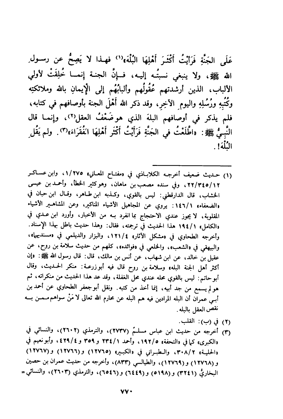 عَلَى الْجَنَّةِ فَرَأَيْتُ أَكْثَرَ أَهْلِهَا الْبُلْهَ» " فَهَذَا لَا يَصِحُّ عَنْ رَسُولِ اللَّهِ صَلَّى اللَّهُ عَلَيْهِ وَسَلَّمَ، وَلَا يَنْبَغِي نِسْبَتُهُ إِلَيْهِ، فَإِنَّ الْجَنَّةَ إِنَّمَا خُلِقَتْ لِأُولِي الْأَلْبَابِ، الَّذِينَ أَرْشَدَتْهُمْ عُقُولُهُمْ وَأَلْبَابُهُمْ إِلَى الْإِيمَانِ بِاللَّهِ وَمَلَائِكَتِهِ وَكُتُبِهِ وَرُسُلِهِ وَالْيَوْمِ الْآخِرِ. وَقَدْ ذَكَرَ اللَّهُ أَهْلَ الْجَنَّةِ بِأَوْصَافِهِمْ فِي كِتَابِهِ، فَلَمْ يَذْكُرْ فِي أَوْصَافِهِمُ الْبَلَهَ، الَّذِي هُوَ ضَعْفُ الْعَقْلِ، وَإِنَّمَا قَالَ النَّبِيُّ صَلَّى اللَّهُ عَلَيْهِ وَسَلَّمَ: «اطَّلَعْتُ فِي الْجَنَّةِ فَرَأَيْتُ أَكْثَرَ أَهْلِهَا الْفُقَرَاءَ» . وَلَمْ يَقُلِ الْبُلْهَ!
