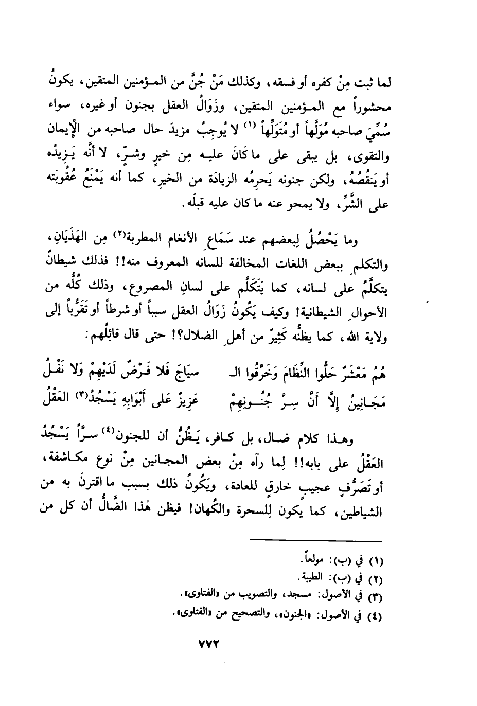 وَمَا يَحْصُلُ لِبَعْضِهِمْ عِنْدَ سَمَاعِ الْأَنْغَامِ الْمُطْرِبَةِ، مِنَ الْهَذَيَانِ، وَالتَّكَلُّمِ لِبَعْضِ اللُّغَاتِ الْمُخَالِفَةِ لِلِسَانِهِ الْمَعْرُوفِ مِنْهُ! ! فَذَلِكَ شَيْطَانٌ يَتَكَلَّمُ عَلَى لِسَانِهِ، كَمَا يَتَكَلَّمُ عَلَى لِسَانِ الْمَصْرُوعِ، وَذَلِكَ كُلُّهُ مِنَ الْأَحْوَالِ الشَّيْطَانِيَّةِ! وَكَيْفَ يَكُونُ زَوَالُ الْعَقْلِ سَبَبًا أَوْ شَرْطًا أَوْ تَقَرُّبًا إِلَى وِلَايَةِ اللَّهِ، كَمَا يَظُنُّهُ كَثِيرٌ مِنْ أَهْلِ الضَّلَالِ؟ ! حَتَّى قَالَ قَائِلُهُمْ: