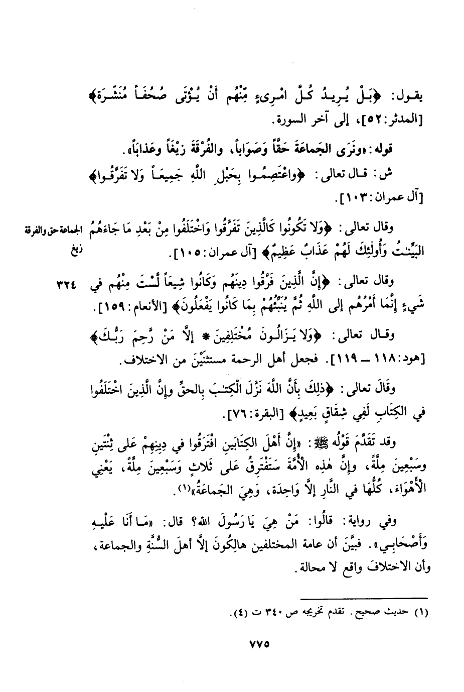 ش: قَالَ اللَّهُ تَعَالَى: {وَاعْتَصِمُوا بِحَبْلِ اللَّهِ جَمِيعًا وَلَا تَفَرَّقُوا} [آلِ عِمْرَانَ: 103] . وَقَالَ تَعَالَى: {وَلَا تَكُونُوا كَالَّذِينَ تَفَرَّقُوا وَاخْتَلَفُوا مِنْ بَعْدِ مَا جَاءَهُمُ الْبَيِّنَاتُ وَأُولَئِكَ لَهُمْ عَذَابٌ عَظِيمٌ} [آلِ عِمْرَانَ: 105] . وَقَالَ تَعَالَى: {إِنَّ الَّذِينَ فَرَّقُوا دِينَهُمْ وَكَانُوا شِيَعًا لَسْتَ مِنْهُمْ فِي شَيْءٍ إِنَّمَا أَمْرُهُمْ إِلَى اللَّهِ ثُمَّ يُنَبِّئُهُمْ بِمَا كَانُوا يَفْعَلُونَ} [الْأَنْعَامِ: 159] . وَقَالَ تَعَالَى: {وَلَا يَزَالُونَ مُخْتَلِفِينَ إِلَّا مَنْ رَحِمَ رَبُّكَ} [هود: 118]