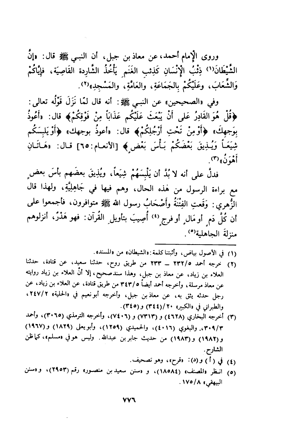 وَرَوَى الْإِمَامُ أَحْمَدُ عَنْ مُعَاذِ بْنِ جَبَلٍ، أَنَّ النَّبِيَّ صَلَّى اللَّهُ عَلَيْهِ وَسَلَّمَ، قَالَ: «إِنَّ الشَّيْطَانَ ذِئْبُ الْإِنْسَانِ، كَذِئْبِ الْغَنَمِ، يَأْخُذُ الشَّاةَ الْقَاصِيَةَ، فَإِيَّاكُمْ وَالشِّعَابَ، وَعَلَيْكُمْ بِالْجَمَاعَةِ، وَالْعَامَّةِ، وَالْمَسْجِدِ» . وَفِي الصَّحِيحَيْنِ عَنِ النَّبِيِّ صَلَّى اللَّهُ عَلَيْهِ وَسَلَّمَ: «أَنَّهُ قَالَ لَمَّا نَزَلَ قَوْلُهُ تَعَالَى: " {قُلْ هُوَ الْقَادِرُ عَلَى أَنْ يَبْعَثَ عَلَيْكُمْ عَذَابًا مِنْ فَوْقِكُمْ} [الْأَنْعَامِ: 65] قَالَ: هَاتَانِ أَهْوَنُ» .