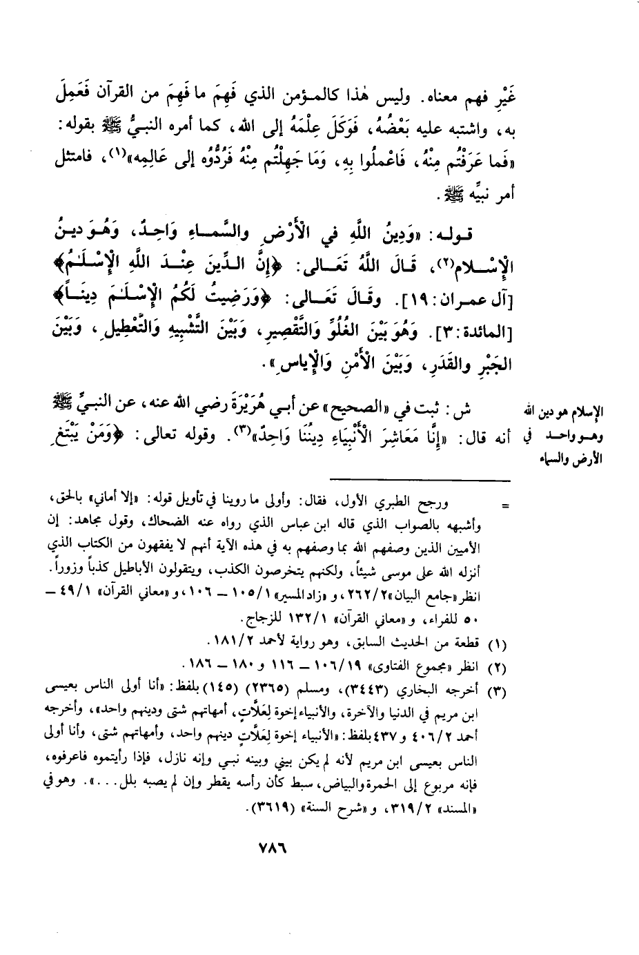 ش: ثَبَتَ فِي الصَّحِيحِ عَنْ أَبِي هُرَيْرَةَ رَضِيَ اللَّهُ عَنْهُ، عَنِ النَّبِيِّ صَلَّى اللَّهُ عَلَيْهِ وَسَلَّمَ أَنَّهُ قَالَ: «إِنَّا مَعَاشِرَ الْأَنْبِيَاءِ دِينُنَا وَاحِدٌ» . وَقَوْلُهُ تَعَالَى: