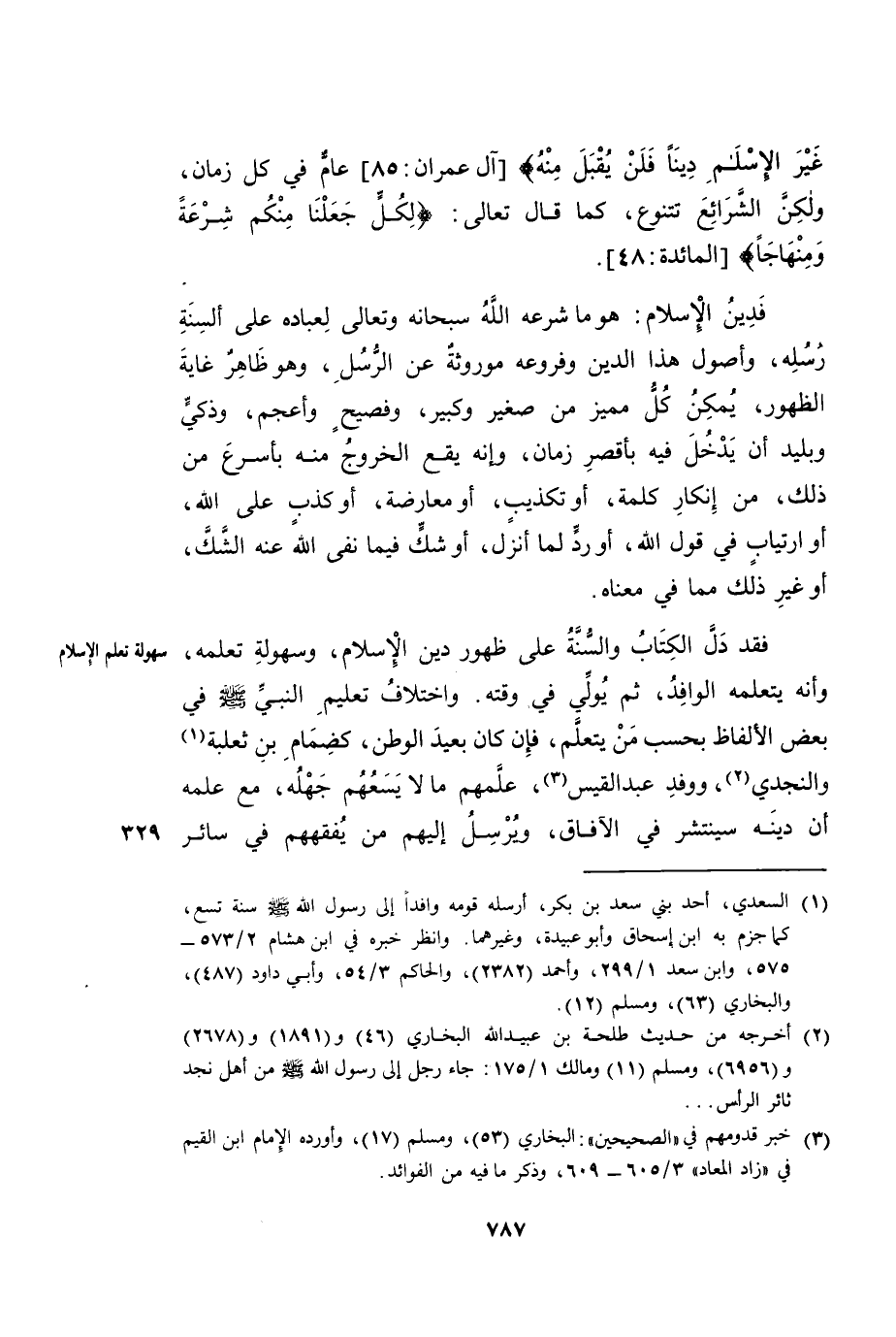 فَدِينُ الْإِسْلَامِ هُوَ مَا شَرَعَهُ اللَّهُ سُبْحَانَهُ وَتَعَالَى لِعِبَادِهِ عَلَى أَلْسِنَةِ رُسُلِهِ، وَأُصُولُ هَذَا الدِّينِ وَفُرُوعُهُ مَوْرُوثَةٌ عَنِ الرُّسُلِ، وَهُوَ ظَاهِرٌ غَايَةَ الظُّهُورِ، يُمْكِنُ كُلُّ مُمَيِّزٍ مِنْ صَغِيرٍ وَكَبِيرٍ، وَفَصِيحٍ وَأَعْجَمَ، وَذَكِيٍّ وَبَلِيدٍ -: أَنْ يَدْخُلَ فِيهِ بِأَقْصَرِ زَمَانٍ، وَإِنَّهُ يَقَعُ الْخُرُوجُ مِنْهُ بِأَسْرَعَ مِنْ ذَلِكَ، مِنْ إِنْكَارِ كَلِمَةٍ، أَوْ تَكْذِيبٍ، أَوْ مُعَارَضَةٍ، أَوْ كَذِبٍ عَلَى اللَّهِ، أَوِ ارْتِيَابٍ فِي قَوْلِ اللَّهِ تَعَالَى، أَوْ رَدٍّ لِمَا أَنْزَلَ، أَوْ شَكٍّ فِيمَا نَفَى اللَّهُ عَنْهُ الشَّكَّ، أَوْ غَيْرِ ذَلِكَ مِمَّا فِي مَعْنَاهُ.