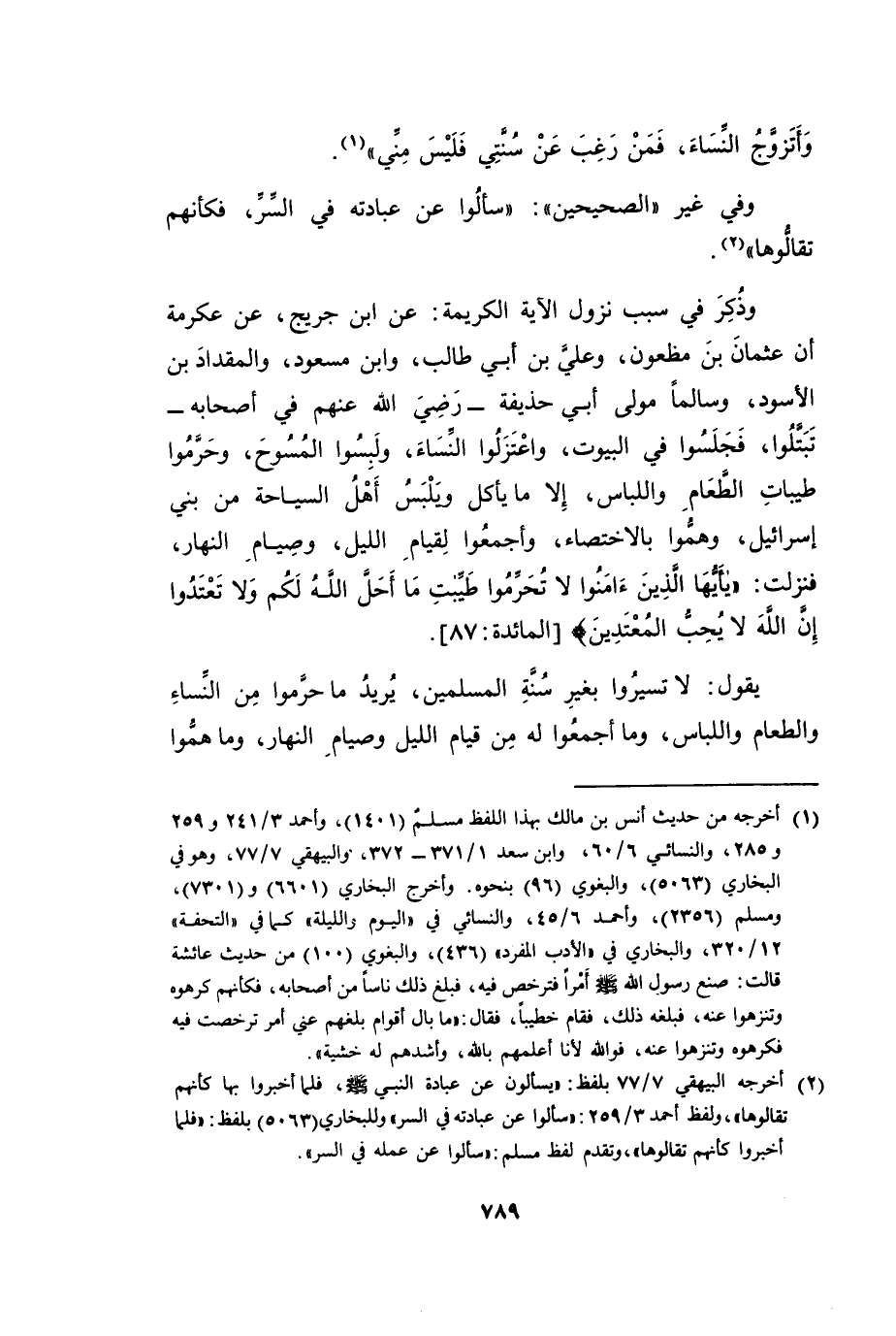 وَفِي غَيْرِ الصَّحِيحَيْنِ: «سَأَلُوا عَنْ عِبَادَتِهِ فِي السِّرِّ، فَكَأَنَّهُمْ تَقَالُّوهَا» .