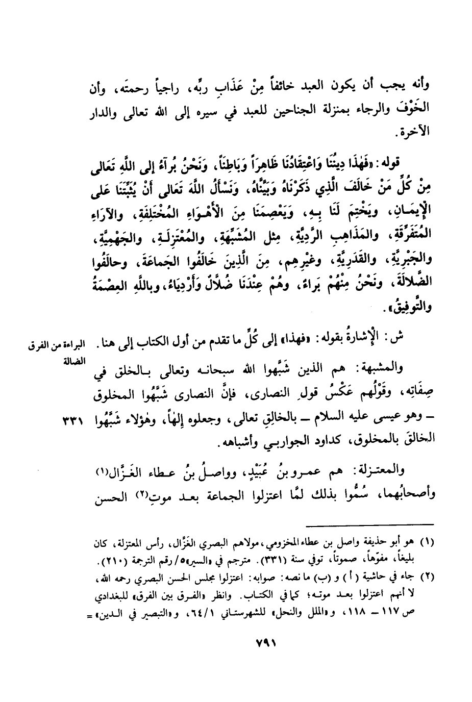وَالْمُعْتَزِلَةُ: هُمْ عَمْرُو بْنُ عُبَيْدٍ، وَوَاصِلُ بْنُ عَطَاءٍ الْغَزَّالُ وَأَصْحَابُهُمَا، سُمُّوا بِذَلِكَ لَمَّا اعْتَزَلُوا الْجَمَاعَةَ بَعْدَ مَوْتِ الْحَسَنِ