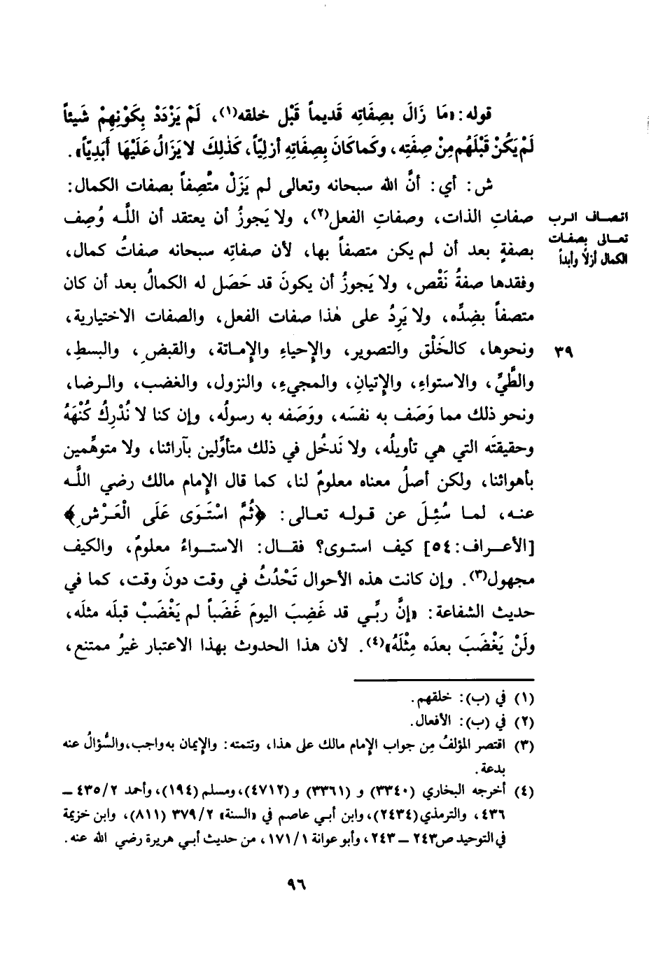 ش: أَيْ: أَنَّ اللَّهَ سُبْحَانَهُ وَتَعَالَى لَمْ يَزَلْ مُتَّصِفًا بِصِفَاتِ الْكَمَالِ: صِفَاتِ الذَّاتِ وَصِفَاتِ الْفِعْلِ. وَلَا يَجُوزُ أَنْ يُعْتَقَدَ أَنَّ اللَّهَ وُصِفَ بِصِفَةٍ بَعْدَ أَنْ لَمْ يَكُنْ مُتَّصِفًا بِهَا، لِأَنَّ صِفَاتِهِ سُبْحَانَهُ صِفَاتُ كَمَالٍ، وَفَقْدَهَا صِفَةُ نَقْصٍ، وَلَا يَجُوزُ أَنْ يَكُونَ قَدْ حَصَلَ لَهُ الْكَمَالُ بَعْدَ أَنْ كَانَ مُتَّصِفًا بِضِدِّهِ. وَلَا يَرِدُ عَلَى هَذِهِ صِفَاتُ الْفِعْلِ وَالصِّفَاتُ الِاخْتِيَارِيَّةُ وَنَحْوُهَا، كَالْخَلْقِ وَالتَّصْوِيرِ، وَالْإِمَاتَةِ وَالْإِحْيَاءِ، وَالْقَبْضِ وَالْبَسْطِ وَالطَّيِّ، وَالِاسْتِوَاءِ وَالْإِتْيَانِ وَالْمَجِيءِ، وَالنُّزُولِ، وَالْغَضَبِ وَالرِّضَا، وَنَحْوِ ذَلِكَ مِمَّا وَصَفَ بِهِ نَفْسَهُ وَوَصَفَهُ بِهِ رَسُولُهُ، وَإِنْ كُنَّا لَا نُدْرِكُ كُنْهَهُ وَحَقِيقَتَهُ الَّتِي هِيَ تَأْوِيلُهُ، وَلَا نَدْخُلُ فِي ذَلِكَ مُتَأَوِّلِينَ بِآرَائِنَا، وَلَا مُتَوَهِّمِينَ بِأَهْوَائِنَا، وَلَكِنْ أَصْلُ مَعْنَاهُ مَعْلُومٌ لَنَا، كَمَا قَالَ الْإِمَامُ مَالِكٌ رَضِيَ اللَّهُ عَنْهُ، لَمَّا سُئِلَ عَنْ قَوْلِهِ تَعَالَى: {ثُمَّ اسْتَوَى عَلَى الْعَرْشِ} [الأعراف: 54] (الْأَعْرَافِ: 54) : كَيْفَ اسْتَوَى؟ فَقَالَ: الِاسْتِوَاءُ مَعْلُومٌ، وَالْكَيْفُ مَجْهُولٌ. وَإِنْ كَانَتْ هَذِهِ الْأَحْوَالُ تَحْدُثُ فِي وَقْتٍ دُونَ وَقْتٍ، كَمَا فِي حَدِيثِ الشَّفَاعَةِ: «إِنَّ رَبِّي قَدْ غَضِبَ الْيَوْمَ غَضَبًا لَمْ يَغْضَبْ قَبْلَهُ مِثْلَهُ، وَلَنْ يَغْضَبَ بَعْدَهُ مِثْلَهُ» . لِأَنَّ هَذَا الْحُدُوثَ بِهَذَا الِاعْتِبَارِ غَيْرُ مُمْتَنَعٍ،