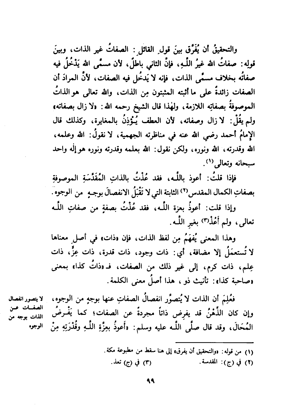 فَعُلِمَ أَنَّ الذَّاتَ لَا يُتَصَوَّرُ انْفِصَالُ الصِّفَاتِ عَنْهَا بِوَجْهٍ مِنَ الْوُجُوهِ، وَإِنْ كَانَ الذِّهْنُ قَدْ يَفْرِضُ ذَاتًا مُجَرَّدَةً عَنِ الصِّفَاتِ، كَمَا يَفْرِضُ الْمُحَالَ. وَقَدْ قَالَ صَلَّى اللَّهُ عَلَيْهِ وَسَلَّمَ: «أَعُوذُ بِعِزَّةِ اللَّهِ وَقُدْرَتِهِ مِنْ