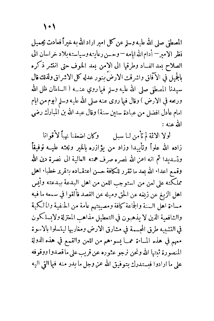 يَوْمٌ مِنْ أَيَّامِ إِمَامٍ عَادِلٍ أَفْضَلُ مِنْ عِبَادَةِ سِتِّينَ سَنَةً وَقَالَ عَبْد اللَّهِ بن الْمُبَارك رَضِيَ اللَّهُ عَنْهُ ... لَوْلَا الْأَئِمَّة لم تأمن لنَا سبل ... وَكَانَ أضعفنَا نهبًا لأقوانَا ...