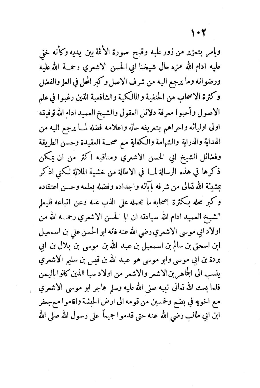 وَيَأْمُر بتعزيز من زور عَلَيْهِ وقبح صُورَة الْأَئِمَّة بَين يَدَيْهِ وَكَأَنَّهُ خَفِي عَلَيْهِ آدام الله عزوجل حَال شَيْخه أَبِي الْحسن الْأَشْعَرِيّ رَحْمَة اللَّه عَلَيْهِ ورضوانه وَمَا يرجع إِلَيْهِ من شرف الأَصْل وَكبر الْمحل فِي الْعلم وَالْفضل وَكَثْرَة الْأَصْحَاب من الْحَنَفِيَّة والمالكية وَالشَّافِعِيَّة الَّذين رَغِبُوا فِي علم الْأُصُول وأحبوا معرفَة دَلَائِل الْعُقُول وَالشَّيْخ العميد أدام اللَّه توفيقه أولى أوليائه وأحراهم بتعريفه حَاله وإعلامه فَضله لما يرجع إِلَيْهِ من الْهِدَايَة والدراية والشهامة والكفاية مَعَ صِحَة العقيدة وَحسن الطَّرِيقَة وفضائل الشَّيْخ أَبِي الْحسن الْأَشْعَرِيّ ومنَاقبه أَكثر من أَن يُمكن ذكرهَا فِي هَذِهِ الرسَالَة لما فِي الإطالة من خشيَة الملالة لكى أذكر بِمَشِيئَة اللَّه تَعَالَى من شرفه بآبائه وأجداده وفضله بِعِلْمِهِ وَحسن اعْتِقَاده وَكبر مَحَله بِكَثْرَة أَصْحَابه مَا يحملهُ على الذب عَنهُ وَعَن أَتْبَاعه فَليعلم الشَّيْخ العميد أدام اللَّه سيادته أَن أَبَا الْحسن الْأَشْعَرِيّ رَحمَه اللَّه من أَوْلَاد أَبِي مُوسَى الْأَشْعَرِيّ رَضِيَ اللَّهُ عَنْهُ فَإِنَّهُ أَبُو الْحسن عَليّ بن اسمعيل ابْن اسحق بن سَالم بن اسمعيل بْنِ عَبْدِ اللَّهِ بْنِ مُوسَى بْنِ بِلالِ بْنِ أَبِي بُرْدَةَ بن أَبِي مُوسَى وأَبُو مُوسَى هُوَ عَبْد اللَّهِ بن قيس بن سليم الْأَشْعَرِيّ ينْسب إِلَى الْجمَاهِر بن الْأَشْعر والأشعر من أَوْلَاد سبأ الَّذين كَانُوا بِالْيمن فَلَمَّا بعث اللَّه تَعَالَى نبيه صَلَّى اللَّهُ عَلَيْهِ وَسَلَّمَ هَاجر أَبُو مُوسَى الْأَشْعَرِيّ مَعَ أَخَوَيْهِ فِي بضع وَخمسين من قومه إِلَى أَرض الْحَبَشَة وَأَقَامُوا مَعَ جَعْفَر ابْن أَبِي طَالب رَضِيَ اللَّهُ عَنْهُ حَتَّى قدمُوا جَمِيعًا على رَسُول اللَّهِ صَلَّى اللَّهُ