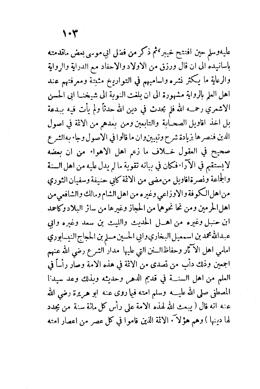 عَلَيْهِ وَسَلَّمَ حِينَ افْتَتَحَ خَيْبَرَ ثمَّ ذكر من فضل أَبِي مُوسَى بعض مَا قَدمته بأسانيده إِلَى أَن قَالَ ورزق من الولاد والأحفاد مَعَ الدِّرَايَة وَالرِّوَايَة وَالرِّعَايَة مَا يكثر نشره وأساميهم فِي التواريخ مثبتة ومعرفتهم عِنْد أهل الْعلم بالرواية مَشْهُورَة إِلَى أَن بلغت النّوبَة إِلَى شيخنَا أَبِي الْحسن الْأَشْعَرِيّ رَحْمَة اللَّه فَلم يحدث فِي دين اللَّه حَدثا وَلم يَأْتِ فِيهِ ببدعة بل أَخذ أقاويل الصَّحَابَة وَالتَّابِعِينَ وَمن بعدهمْ من الْأَئِمَّة فِي أصُول الدّين فنصرها بِزِيَادَة شرح وتبيين وَأَن مَا قَالُوا فِي الْأُصُول وَجَاء بِهِ الشَّرْع صَحِيح فِي الْعُقُول خلاف مَا زعم أهل الْأَهْوَاء من أَن بعضه لَا يَسْتَقِيم فِي الآراء فَكَانَ فِي بَيَانه تَقْوِيَة مَا لم يدل عَلَيْهِ من أهل السّنة وَالْجَمَاعَة وَنَصره أقاويل من مضى من الْأَئِمَّة كَأبي حنيفَة وسُفْيَان الثَّوْريّ من أهل الْكُوفَة وَالْأَوْزَاعِيّ وَغَيره من أهل الشَّام وَمَالك وَالشَّافِعِيّ من أهل الْحَرَمَيْنِ وَمن نجا نَحْوهمَا من الْحجاز وَغَيرهَا من سَائِر الْبِلَاد وكأحمد ابْن حَنْبَل وَغَيره من أهل الحَدِيث وَاللَّيْث بن سعد وَغَيره وَأبي عبد الله مُحَمَّد بن اسمعيل البُخَارِيّ وَأبي الْحسن مُسلم بن الْحجَّاج النَّيْسَابُورِي إمامي أهل الْآثَار وحفاظ السّنَن الَّتِي عَلَيْهَا مدَار الشَّرْع رَضِيَ اللَّهُ عَنْهُم أَجْمَعِينَ وَذَلِكَ دأب من تصدى من الْأَئِمَّة فِي هَذِهِ الْأمة وَصَارَ رَأْسا فِي الْعلم من أهل السّنة فِي قديم الدَّهْر وَحَدِيثه وَبِذَلِك وعد سيدنَا الْمُصْطَفى صَلَّى اللَّهُ عَلَيْهِ وَسَلَّمَ أمته فِيمَا رُوِيَ عَنهُ أَبُو هُرَيْرَة رَضِيَ اللَّهُ عَنْهُ أَنه قَالَ