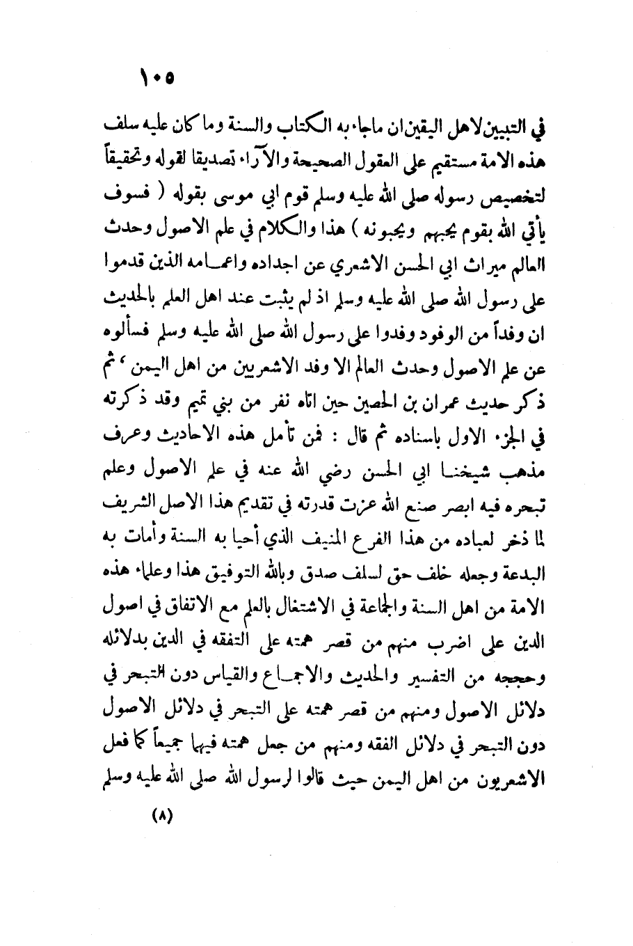 فِي التَّبْيِين لأهل الْيَقِين أَن مَا جَاءَ بِهِ الْكتاب وَالسّنة وماكان عَلَيْهِ سلف هَذِهِ الْأمة مُسْتَقِيم على الْعُقُول الصَّحِيحَة والآراء تَصْدِيقًا لقَوْله وتحقيقًا لتخصيص رَسُوله صَلَّى اللَّهُ عَلَيْهِ وَسَلَّمَ قوم أَبِي مُوسَى بقوله {فَسَوْفَ يَأْتِي اللَّهُ بِقوم يُحِبهُمْ وَيُحِبُّونَهُ} هَذَا وَالْكَلَام فِي علم الْأُصُول وَحدث الْعَالم مِيرَاث أَبِي الْحسن الْأَشْعَرِيّ عَن أجداده وأعمامه الَّذين قدمُوا على رَسُول اللَّه صَلَّى الله عَلَيْهِ وَسلم فَسَأَلُوهُ عَن علم الْأُصُول وحَدَث الْعَالم إِلَّا وَفد الْأَشْعَرِيين من أهل الْيمن ثمَّ ذكر حَدِيث عمرَان بن الْحصين حِين أَتَاهُ نفر من بَنِي تَمِيم وَقد ذكرته فِي الْجُزْء الأول بإسنَاده ثمَّ قَالَ فَمن تَأمل هَذِهِ الْأَحَادِيث وَعرف مَذْهَب شيخنَا أَبِي الْحسن رَضِيَ اللَّهُ عَنْهُ فِي علم الْأُصُول وعَلِم تبحره فِيهِ أبْصر صنع اللَّه عزت قدرته فِي تَقْدِيم هَذَا الأَصْل الشريف لما ذخر لِعِبَادِهِ من هَذَا الْفَرْع المنيف الَّذِي أَحْيَا بِهِ السّنة وأمات بِهِ الْبِدْعَة وَجعله خلف حق لسلف صدق وبِاللَّهِ التَّوْفِيق هَذَا وعلماء هَذِهِ الْأمة من أهل السّنة وَالْجَمَاعَة فِي الِاشْتِغَال بِالْعلمِ مَعَ الِاتِّفَاق فِي أصُول الدّين على اضْرِب مِنْهُم من قصر همته على التفقه فِي الدّين بدلائله وحججه من التَّفْسِير والْحَدِيث وَالْإِجْمَاع وَالْقِيَاس دون التبحر فِي دَلَائِل الْأُصُول وَمِنْهُم من قصر همته على التبحر فِي دَلَائِل الْأُصُول دون التبحر فِي دَلَائِل الْفِقْه وَمِنْهُم من جعل همته فيهمَا جَمِيعًا كَمَا فعل الأشعريون من أهل الْيمن حَيْثُ قَالُوا لرَسُول اللَّه صَلَّى اللَّهُ عَلَيْهِ وَسَلَّمَ