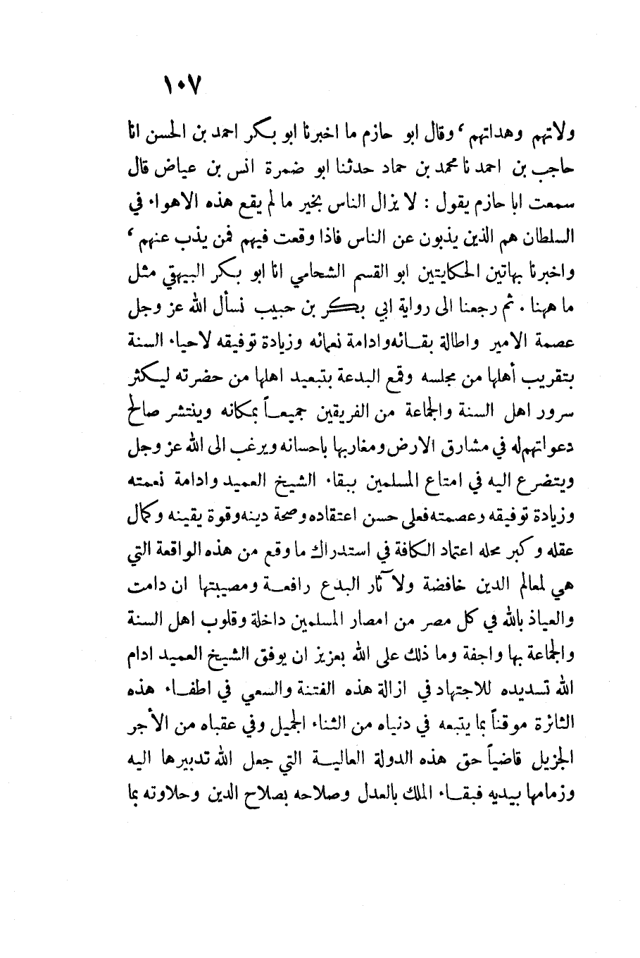 وُلاتُهُمْ وَهُدَاتُهُمْ وَقَالَ أَبُو حَازِم مَا أَخْبَرَنَا أَبُو بَكْرٍ أَحْمَدُ بن الْحسن أَنا حَاجِب بن أَحْمَدَ نَا مُحَمَّدُ بْنُ حَمَّاد حَدَّثَنَا أَبُو ضَمرَة أنس بن عِيَاض قَالَ سَمِعت أَبَا حَازِم يَقُول لَا يَزَالُ النَّاس بِخَير مَا لم يَقع هَذِهِ الأَهْوَاءُ فِي السُّلْطَانِ هُمُ الَّذِينَ يَذُبُّونَ عَنِ النَّاسِ فَإِذَا وَقَعْتَ فِيهِمْ فَمَنْ يَذُبُّ عَنْهُمْ وَأخْبرنَا بِهَاتَيْنِ الحكايتين أَبُو الْقسم الشحامي أَنا أَبُو بكر الْبَيْهَقِيُّ مثل مَا ههنَا ثمَّ رجعنَا إِلَى رِوَايَة أبي بكر بن حبيب نسْأَل الله عزوجل عصمَة الْأَمِير وإطالة بَقَائِهِ وإدامة نعمائه وَزِيَادَة توفيقه لإحياء السّنة بتقريب أَهلهَا من مَجْلِسه وقمع الْبِدْعَة بتبعيد أَهلهَا من حَضرته ليكْثر سرُور أهل السّنة وَالْجَمَاعَة من الْفَرِيقَيْنِ جَمِيعًا بمكانه وينتشر صَالح دعواتهم لَهُ فِي مَشَارِق الأَرْض وَمَغَارِبهَا بإحسانه ويرغب إِلَى الله عزوجل ويتضرع إلية فِي إمتاع الْمُسلمين بِبَقَاء الشَّيْخ العميد وإدامة نعْمَته وَزِيَادَة توفيقه وعصمته فعلى حسن اعْتِقَاده وَصِحَّة دينه وَقُوَّة يقينه وَكَمَال عقله وَكبر مَحَله اعْتِمَاد الكافة فِي اسْتِدْرَاك مَا وَقع من هَذِهِ الْوَاقِعَة الَّتِي هِيَ لمعالم الدّين خافضة ولآثار الْبدع رَافِعَة ومصيبتها إِن دَامَت وَالْعِيَاذ بِاللَّهِ فِي كل مصر من أَمْصَار الْمُسلمين دَاخِلَة وَقُلُوب أهل السّنة وَالْجَمَاعَة بهَا واجفة وَمَا ذَلِك على اللَّه بعزيز أَن يوفق الشَّيْخ العميد أدام اللَّه تسديده للِاجْتِهَاد فِي إِزَالَة هَذِهِ الْفِتْنَة وَالسَّعْي فِي إطفاء هَذِهِ الثائرة موقنًا بِمَا يتبعهُ فِي دُنْيَاهُ من الثنَاء الْجَمِيل وَفِي عقباه من الْأجر الجزيل قَاضِيا حق هَذِهِ الدولة الْعَالِيَة الَّتِي جعل الله تدبيرها إِلَيْهِ وزمامها بيدَيْهِ فبقاء الْملك بِالْعَدْلِ وصلاحه بصلاح الدّين وحلاوته بِمَا