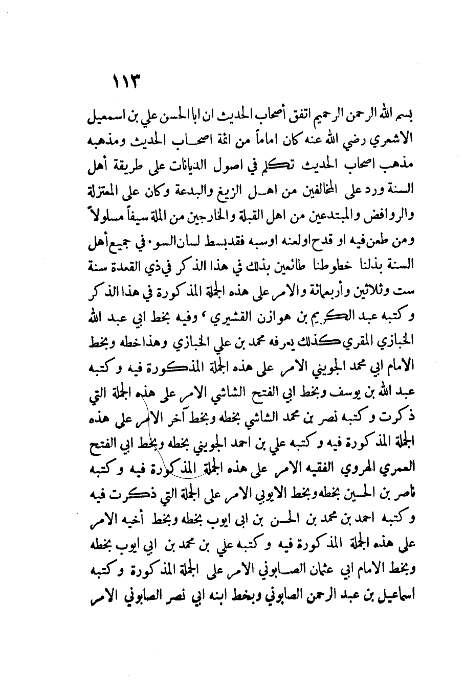 بِسم اللَّه الرَّحْمَن الرَّحِيم اتّفق أَصْحَاب الحَدِيث أَن أَبَا الْحسن عَليّ بن إِسْمَاعِيلَ الْأَشْعَرِيّ رَضِيَ اللَّهُ عَنْهُ كَانَ إِمَامًا من أَئِمَّة أَصْحَاب الحَدِيث ومذهبه مَذْهَب أَصْحَاب الحَدِيث تكلم فِي أصُول الديانَات على طَريقَة أهل السّنة ورد على الْمُخَالفين من أهل الزيغ والبدعة وَكَانَ من الْمُعْتَزلَة وَالرَّوَافِض والمبتدعين من أهل الْقبْلَة والخارجين من الْملَّة سَيْفا مسلولا وَمن طعن فِيهِ أَو قدح أَو لَعنه أَو سبه فقد بسط لِسَان السوء فِي جَمِيع أهل السّنة بذلنَا خطوطنَا طائعين بذلك فِي هَذَا الذّكر فِي ذِي الْقعدَة سنة سِتّ وَثَلَاثِينَ وَأَرْبَعمِائَة وَالْأَمر على هَذِهِ الْجُمْلَة الْمَذْكُورَة فِي هَذَا الذّكر وَكتبه عبد الْكَرِيم بن هوَازن الْقشيرِي وَفِيه بِخَط أَبِي عَبْد اللَّهِ الْخَبَّازِي الْمقري كَذَلِك يعرفهُ مُحَمَّد بن عَليّ الجنازي وَهَذَا خطه وبخط الإِمَام أَبِي مُحَمَّد الْجُوَيْنِيّ الْأَمر على هَذِهِ الْجُمْلَة الْمَذْكُورَة فِيهِ وَكتبه عَبْد اللَّهِ بن يُوسُفَ وبخط أَبِي الْفَتْح الشَّاشِي الْأَمر على هَذِهِ الْجُمْلَة الَّتِي ذكرت وَكتبه نصر بن مُحَمَّد الشَّاشِي بِخَطِّهِ وبخط آخر الْأَمر على هَذِهِ الْجُمْلَة الْمَذْكُورَة فِيهِ وَكتبه عَليّ بن أَحْمَدَ الْجُوَيْنِيّ بِخَطِّهِ وبخط أَبِي الْفَتْح الْعمريّ الْهَرَوِيّ الْفَقِيه الْأَمر على هَذِهِ الْجُمْلَة الْمَذْكُورَة فِيهِ وَكتبه نَاصر بن الْحُسَيْنِ بِخَطِّهِ وبخط الأيوبي الْأَمر على الْجُمْلَة الَّتِي ذكرت فِيهِ وَكتبه أَحْمد بْنِ مُحَمَّدِ بْنِ الْحَسَنِ بْنِ أَبِي أَيُّوب بِخَطِّهِ وبخط أَخِيه الْأَمر على هَذِهِ الْجُمْلَة الْمَذْكُورَة فِيهِ وَكتبه عَليّ بن مُحَمَّدِ بْنِ أَبِي أَيُّوب بِخَطِّهِ وبخط الإِمَام أَبِي عُثْمَانَ الصَّابُونِي الْأَمر على الْجُمْلَة الْمَذْكُورَة وَكتبه إِسْمَاعِيل بن عَبْدِ الرَّحْمَنِ الصَّابُونِي وبخط ابْنه أَبِي نصر الصَّابُونِي الْأَمر