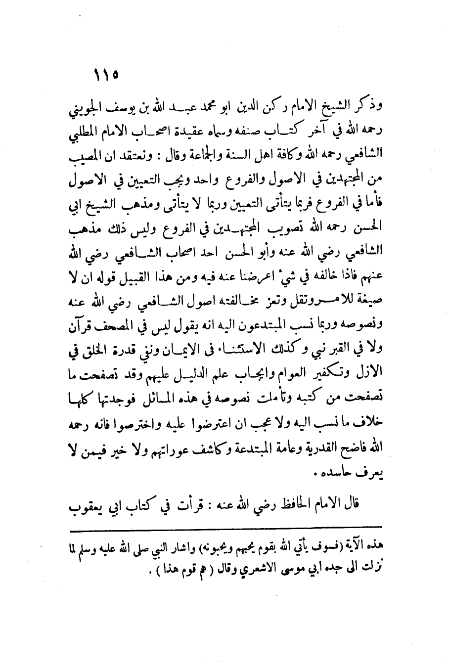وَذكر الشَّيْخ الإِمَام ركن الدّين أَبُو مُحَمَّدٍ عَبْدُ اللَّهِ بْنُ يُوسُفَ الْجُوَيْنِيّ رَحمَه اللَّه فِي آخر كتاب صنفه وَسَماهُ عقيدة أَصْحَاب الإِمَام المطلبي الشَّافِعِي رَحمَه اللَّه وكافة أهل السّنة وَالْجَمَاعَة وَقَالَ ونعتقد أَن الْمُصِيب من الْمُجْتَهدين فِي الْأُصُول وَالْفُرُوع وَاحِد وَيجب التَّعْيِين فِي الْأُصُول فاما الْفُرُوع فَرُبمَا يَتَأَتَّى التَّعْيِين وَرُبمَا لَا يَتَأَتَّى وَمذهب الشَّيْخ أَبِي الْحسن رَحمَه اللَّه تصويب الْمُجْتَهدين فِي الْفُرُوع وَلَيْسَ ذَلِك مَذْهَب الشَّافِعِي رَضِيَ اللَّهُ عَنْهُ وأَبُو الْحَسَنِ أحد أَصْحَاب الشَّافِعِي رَضِيَ اللَّهُ عَنْهُم فَإِذا خَالفه فِي شَيْء أعرضنَا عَنهُ فِيهِ وَمن هَذَا الْقَبِيل قَوْله أَن لَا صِيغَة لِلْأَمْرِ وتقل وتعز مُخَالفَته أصُول الشَّافِعِي رَضِيَ اللَّهُ عَنْهُ ونصوصه وَرُبمَا نسب المبتدعون إِلَيْهِ أَنه يَقُول لَيْسَ فِي الْمُصحف قُرْآن وَلَا فِي الْقَبْر نَبِي وَكَذَلِكَ الاستثنَاء فِي الْإِيمَان وَنفى قدرَة الْخلق فِي الْأَزَل وتكفير الْعَوام وَإِيجَاب علم الدَّلِيل عَلَيْهِم وَقد تصفحت مَا تصفحت من كتبه وتأملت نصوصه فِي هَذِهِ الْمسَائِل فَوَجَدتهَا كلهَا خلاف مَا نسب إِلَيْهِ وَلَا عجب إِن اعْترضُوا عَلَيْهِ واخترصوا فَإِنَّهُ رَحمَه اللَّه فاضح الْقَدَرِيَّة وَعَامة المبتدعة وَكَاشف عَوْرَاتهمْ وَلَا خير فِيمَن لَا يعرف حاسده