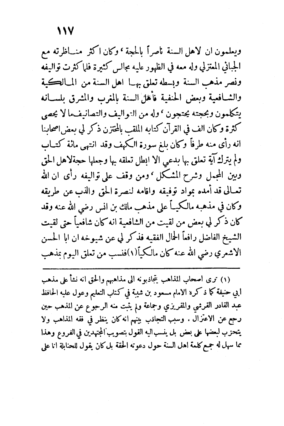 ويعلمون أَن لأهل السّنة نَاصرا بِالْحجَّةِ وَكَانَ أَكثر منَاظرته مَعَ الجبائي المعتزلي وَله مَعَه فِي الظُّهُور عَلَيْهِ مجْلِس كَثِيرَة فَلَمَّا كثرت تواليفه وَنصر مَذْهَب السّنة وَبسطه تعلق بهَا أهل السّنة من الْمَالِكِيَّة وَالشَّافِعِيَّة وَبَعض الْحَنَفِيَّة فَأهل السّنة بالمغرب والمشرق بِلِسَانِهِ يَتَكَلَّمُونَ وبحجته يحتجون وَله من التواليف والتصانيف مَا لَا يُحْصى كَثْرَة وَكَانَ ألف فِي الْقُرْآن كِتَابه الملقب بالمختزن ذكر لي بعض أصحابنَا أَنه رأى مِنْهُ طرفا وَكَانَ بلغ سُورَة الْكَهْف وَقد انتهي مائَة كتاب وَلم يتْرك آيَة تعلق بهَا بدعي إِلَّا بَطل تعلقه بهَا وَجعلهَا حجَّة لأهل الْحق وَبَين الْمُجْمل وَشرح الْمُشكل وَمن وقف على تواليفه رأى أَن اللَّه تَعَالَى قد أمده بمواد توفيقه وأقامه لنصرة الْحق والذب عَن طَرِيقه وَكَانَ فِي مذْهبه مالكيًّا على مَذْهَب مَالك بن أنس رَضِيَ اللَّهُ عَنْهُ وَقد كَانَ ذكر لي بعض من لقِيت من الشَّافِعِيَّة أَنه كَانَ شافعيًّا حَتَّى لقِيت الشَّيْخ الْفَاضِل رَافعا الْحمال الْفَقِيه فَذكر لي عَن شُيُوخه أَن أَبَا الْحسن الْأَشْعَرِيّ رَضِيَ اللَّهُ عَنْهُ كَانَ مالكيًّا فنسب من تعلق الْيَوْم بِمذهب