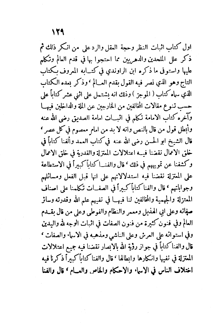 أول كتاب إِثْبَات النّظر وَحجَّة الْعقل وَالرَّدّ على من أنكر ذَلِك ثمَّ ذكر علل الْمُلْحِدِينَ والدهريين مِمَّا احْتَجُّوا بهَا فِي قِدَم العَالَم وَتكلم عَلَيْهَا وَاسْتوْفى مَا ذكره ابْن الراوندي فِي كِتَابه الْمَعْرُوف بِكِتَاب التَّاج وَهُوَ الَّذِي نصر فِيهِ القَوْل بقدم الْعَالم وَذكر بعده الْكتاب الَّذِي سَمَّاهُ كتاب الموجز وَذَلِكَ يشْتَمل على اثْنَي عشر كتابا على حسب تنوع مقَالات الْمُخَالفين من الخارجين عَن الْملَّة والداخلين فِيهَا وَآخره كتاب الْإِمَامَة تكلم فِي إِثْبَات إِمَامَة الصّديق رَضِيَ اللَّهُ عَنْهُ وأبطل قَول من قَالَ بالنَّص وَأَنه لَا بُد من إمامٍ مَعْصُوم فِي كل عصر قَالَ الشَّيْخُ أَبُو الْحَسَنِ رَضِيَ اللَّهُ عَنْهُ فِي كتاب الْعمد وألفنَا كتابا فِي خَلْق الْأَعْمَال نقضنَا فِيهِ اعتلالات الْمُعْتَزلَة والقدرية فِي خلق الْأَعْمَال وكشفنَا عَن تمويههم فِي ذَلِك قَالَ وألفنَا كتابا كَبِيرا فِي الِاسْتِطَاعَة على الْمُعْتَزلَة نقضنَا فِيهِ استدلالاتهم على أَنَّهَا قبل الْفِعْل ومسائلهم وجواباتهم قَالَ وألفنَا كتابا كَبِيرا فِي الصِّفَات تكلمنَا على أصنَاف الْمُعْتَزلَة والجهمية والمخالفين لنَا فِيهَا فِي نفيهم علم اللَّه وَقدرته وَسَائِر صِفَاته وعَلى أَبِي الْهُذيْل وَمعمر والنظام والفوطي وعَلى مَنْ قَالَ بقدم الْعَالم وَفِي فنون كَثِيرَة من فنون الصِّفَات فِي إِثْبَات الْوَجْه لِلَّه وَالْيَدَيْنِ وَفِي استوائه على الْعَرْش وعَلى النَّاشي ومذهبه فِي الْأَسْمَاء وَالصِّفَات قَالَ وألفنَا كتابا فِي جَوَاز رُؤْيَة اللَّه بالأبصار نقضنَا فِيهِ جَمِيع إغتلالات الْمُعْتَزلَة فِي نَفيهَا وإنكارها وإبطالها قَالَ وألفنَا كتابا كَبِيرا ذكرنَا فِيهِ اخْتِلَاف النَّاس فِي الْأَسْمَاء وَالْأَحْكَام وَالْخَاص وَالْعَام قَالَ وألفنَا