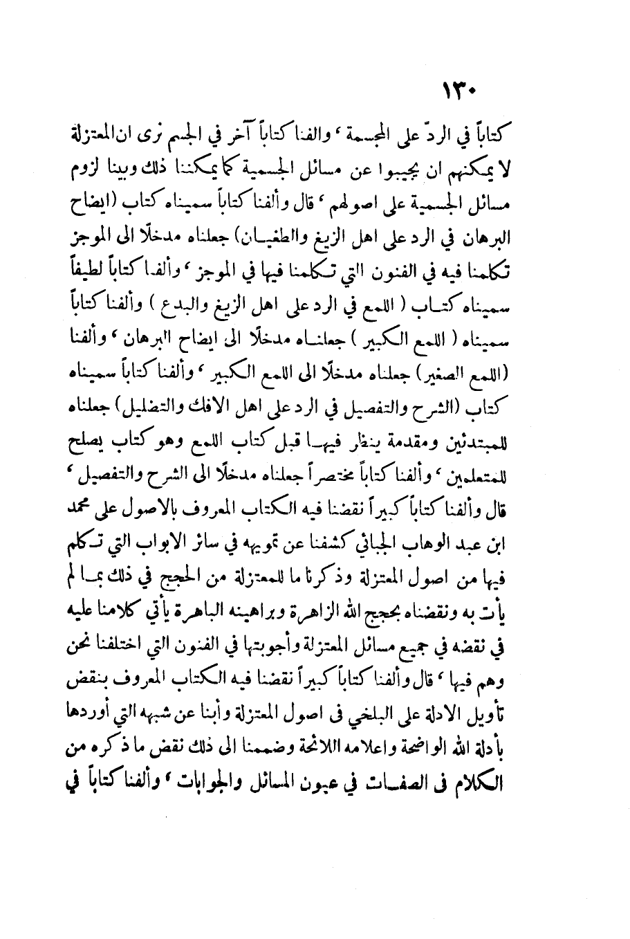 كتابا فِي الردّ على المجسمة وألفنَا كتابا آخر فِي الْجِسْم نرى أَن الْمُعْتَزلَة لَا يُمكنهُم أَن يجيبوا عَن مسَائِل الجسمية كَمَا يمكننا ذَلِك وَبينا لُزُوم مسَائِل الجسمية على أصولهم قَالَ وألفنَا كتابا سمينَاه كتاب إِيضَاح الْبُرْهَان فِي الرَّد على أهل الزيغ والطغيان جعلنَاه مدخلًا إِلَى الموجز تكلمنا فِيهِ فِي الْفُنُون الَّتِي تكلمنَا فِيهَا فِي الموجز وألفنَا كتابا لطيفا سمينَاه كتاب اللمع فِي الرَّد على أهل الزيغ والبدع وألفنا كتابا سميناه اللمع الْكَبِير جعلنَاه مدخلًا إِلَى إِيضَاح الْبُرْهَان وألفنَا اللمع الصَّغِير جعلنَاه مدخلًا إِلَى اللمع الْكَبِير وألفنَا كتابا سمينَاه كتاب الشَّرْح وَالتَّفْصِيل فِي الرَّد على أهل الْإِفْك والتضليل جعلنَاه للمبتدئين ومقدمة ينظر فِيهَا قبل كتاب اللمع وَهُوَ كتاب يصلح للمتعلمين وألفنَا كتابا مُخْتَصرا جعلنَاه مدخلًا إِلَى الشَّرْح وَالتَّفْصِيل قَالَ وألفنَا كتابا كَبِيرا نقضنَا فِيهِ الْكتاب الْمَعْرُوف بالأصول على مُحَمَّد ابْن عَبْدِ الْوَهَّاب الجبائي كشفنَا عَن تمويهه فِي سَائِر الأَبواب الَّتِي تكلم فِيهَا من أصُول الْمُعْتَزلَة وذكرنَا مَا للمعتزلة من الْحجَج فِي ذَلِك بِمَا لم يَأْتِ بِهِ ونقضنَاه بحجج اللَّه الزاهرة وبراهينه الباهرة يَأْتِي كلامنَا عَلَيْهِ فِي نقضه فِي جَمِيع مسَائِل الْمُعْتَزلَة وأجوبتها فِي الْفُنُون الَّتِي اخْتَلَفْنَا نَحن وَهُوَ فِيهَا قَالَ وألفنَا كتابا كَبِيرا نقضنَا فِيهِ الْكتاب الْمَعْرُوف بِنَقْض تَأْوِيل الْأَدِلَّة على الْبَلْخِي فِي أصُول الْمُعْتَزلَة وأبَنَّا عَن شبهه الَّتِي أوردهَا بأدلة اللَّه الْوَاضِحَة وأعلامه اللائحة وضممنَا إِلَى ذَلِك نقض مَا ذكره من الْكَلَام فِي الصِّفَات فِي عُيُون الْمسَائِل والجوابات وألفنَا كتابا فِي