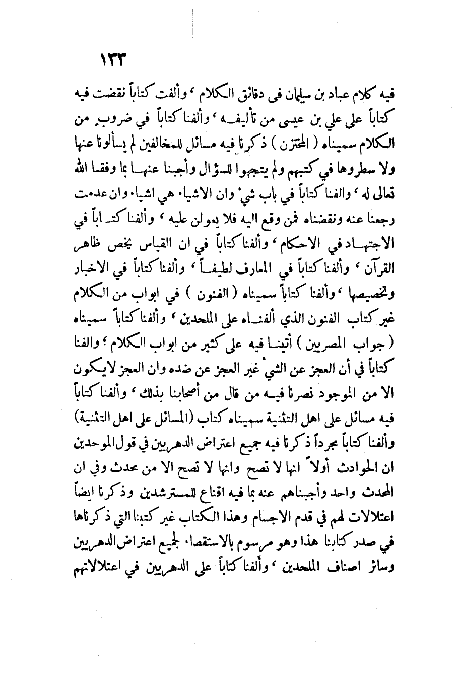 فِيهِ كَلَام عباد بن سُلَيْمَان فِي دقائق الْكَلَام وألفت كتابا نقضت فِيهِ كتابا على عَليّ بن عِيسَى من تأليفه وألفنَا كتابا فِي ضروبٍ من الْكَلَام سمينَاه المختزن ذكرنَا فِيهِ مسَائِل للمخالفين لم يسألونَا عَنْهَا وَلَا سطروها فِي كتبهمْ وَلم يتجهوا للسؤال وأجبنَا عَنْهَا بِمَا وفقنَا اللَّه تَعَالَى لَهُ وألفنَا كتابا فِي بَاب شَيْء وَأَن الْأَشْيَاء هِيَ أَشْيَاء وَإِن عدمت رجعنَا عَنهُ ونقضنَاه فَمن وَقع إِلَيْهِ فَلَا يعولن عَلَيْهِ وألفنَا كتابا فِي الِاجْتِهَاد فِي الْأَحْكَام وألفنَا كتابا فِي أَن الْقيَاس يخص ظَاهر الْقُرْآن وألفنَا كتابا فِي المعارف لطيفا وألفنَا كتابا فِي الْأَخْبَار وتخصيصها وألفنَا كتابا سمينَاه الْفُنُون فِي أَبواب من الْكَلَام غير كتاب الْفُنُون الَّذِي ألفنَاه على الْمُلْحِدِينَ وألفنَا كتابا سمينَاه جَوَاب المصريين أتينَا فِيهِ على كثير من أَبواب الْكَلَام وألفنَا كتابا فِي أَن الْعَجز عَن الشَّيْء غير الْعَجز عَن ضِدّه وَإِن الْعَجز لَا يكون إِلَّا من الْمَوْجُود نصرنَا فِيهِ مَنْ قَالَ مِنْ أصحابْنَا بذلك وألفنَا كتابا فِيهِ مسَائِل على أهل التَّثْنِيَة سمينَاه كتاب الْمسَائِل على أهل التَّثْنِيَة وألفنَا كتابا مُجَردا ذكرنَا فِيهِ جَمِيع اعْتِرَاض الدهريين فِي قَول الْمُوَحِّدين أَن الْحَوَادِث أَولا إِنَّهَا لَا تصح وَأَنَّهَا لَا تصح إِلَّا من مُحدث وَفِي أَن الْمُحدث وَاحِد وأجبْنَاهم عَنهُ بِمَا فِيهِ إقنَاع للمسترشدين وذكرنَا أَيْضا اعتلالات لَهُم فِي قِدَم الْأَجْسَام وَهَذَا الْكتاب غير كتبنَا الَّتِي ذكرنَاها فِي صدر كتابنَا هَذَا وَهُوَ مرسوم بالاستقصاء لجَمِيع اعْتِرَاض الدهريين وَسَائِر أصنَاف الْمُلْحِدِينَ وألفنَا كتابا عَليّ الدهريين فِي اعتلالاتهم