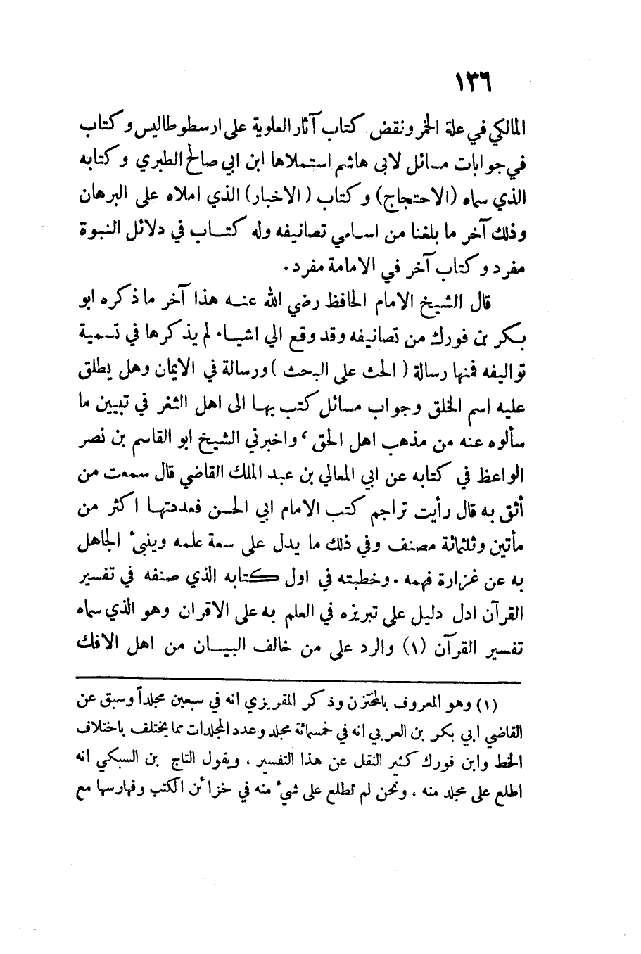قَالَ الشَّيْخ الإِمَام الْحَافِظ رَضِيَ اللَّهُ عَنْهُ هَذَا آخر مَا ذكره أَبُو بكر بن فورك من تصانيفه وَقد وَقع إِلَى أَشْيَاء لم يذكرهَا فِي تَسْمِيَة تواليفه فَمِنْهَا رِسَالَة الْحَث على الْبَحْث ورسالة فِي الْإِيمَان وَهل يُطلق عَلَيْهِ اسْم الْخلق وَجَوَاب مسَائِل كتب بهَا إِلَى أهل الثغر فِي تَبْيِين مَا سَأَلُوهُ عَنهُ من مَذْهَب أهل الْحق وأَخْبَرنِي الشَّيْخ أَبُو الْقَاسِمِ بْنُ نصر الْوَاعِظ فِي كِتَابه عَنْ أَبِي الْمَعَالِي بن عَبْدِ الْمَلِكِ الْقَاضِي قَالَ سَمِعت من أَثِق بِهِ قَالَ رَأَيْت تراجم كتب الإِمَام أَبِي الْحسن فعددتها أَكثر من مِائَتَيْنِ وثلثمائة مُصَنف وَفِي ذَلِك مَا يدل على سَعَة علمه وينبىء الْجَاهِل بِهِ عَن غزارة فهمه وخطبته فِي أول كِتَابه الَّذِي صنفه فِي تَفْسِير الْقُرْآن أدل دَلِيل على تبريزه فِي الْعلم بِهِ على الأقران وَهُوَ الَّذِي سَمَّاهُ تَفْسِير الْقُرْآن وَالرَّدّ على من خَالف الْبَيَان من أهل الْإِفْك