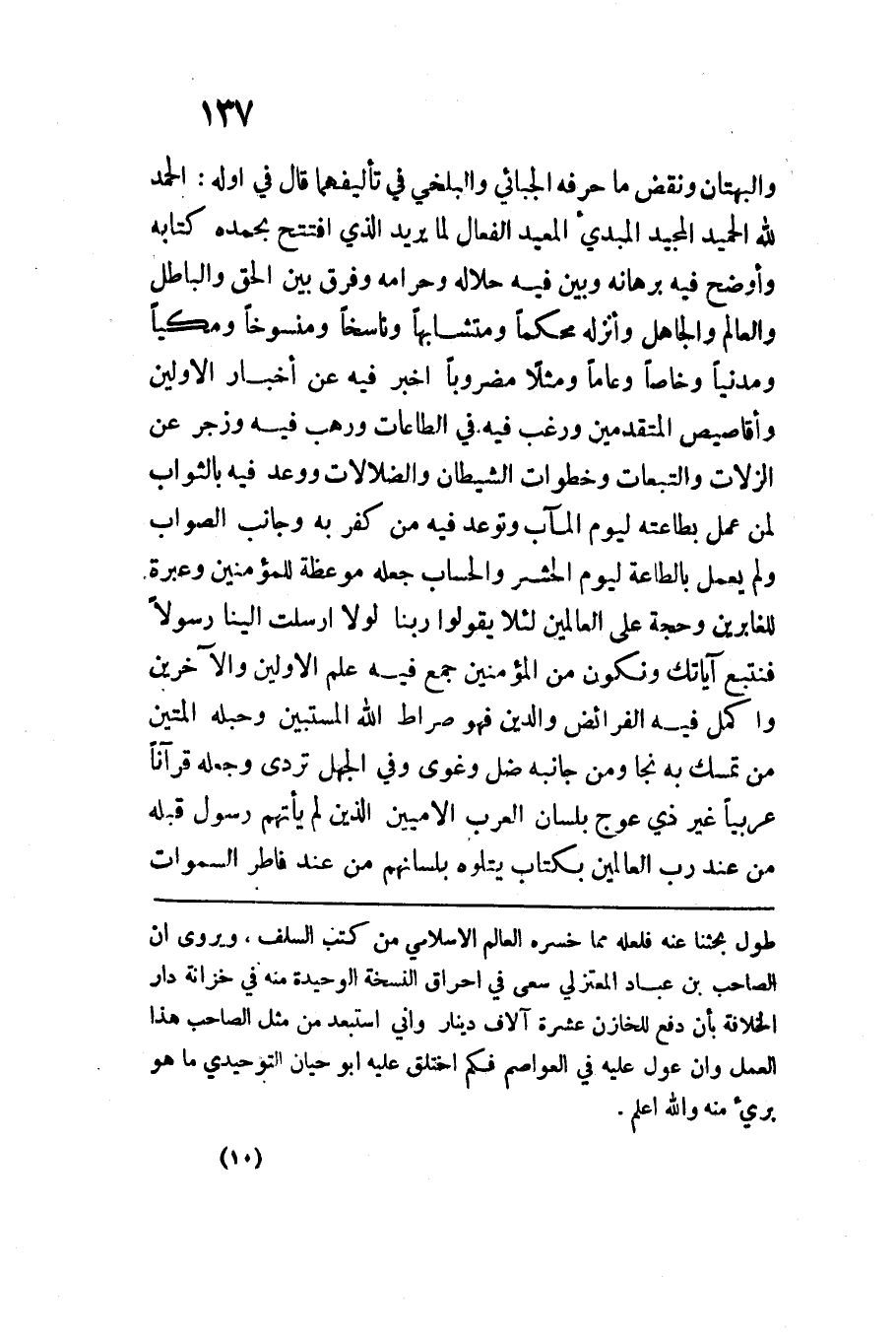 والبهتان وَنقض مَا حرفه الجبائي والبلخي فِي تأليفهما قَالَ فِي أَوله الْحَمد لِلَّه الحميد الْمجِيد المبدىء المعيد الفعال لما يُرِيد الَّذِي افْتتح بِحَمْدِهِ كِتَابه وأوضح فِيهِ برهانه وَبَين فِيهِ حَلَاله وَحَرَامه وَفرق بَين الْحق وَالْبَاطِل والعالم وَالْجَاهِل وأنزله محكما ومتشابها ونَاسخا ومنسوخا ومكيا ومدنيا وخاصا وعاما ومثلا مَضْرُوبا أخبر فِيهِ عَن أَخْبَار الْأَوَّلين وأقاصيص الْمُتَقَدِّمين وَرغب فِيهِ فِي الطَّاعَات ورهب فِيهِ وزجر عَن الزلات والتبعات وخطوات الشَّيْطَان والضلالات ووعد فِيهِ بالثواب لمن عمل بِطَاعَتِهِ ليَوْم المآب وتوعد فِيهِ من كفر بِهِ وجانب الصَّوَاب وَلم يعْمل بِالطَّاعَةِ ليَوْم الْحَشْر والحساب جعله موعظة للْمُؤْمِنين وعبرة للغابرين وَحجَّة على الْعَالمين لِئَلَّا يَقُولُوا رَبَّنَا لَوْلا أَرْسَلْتَ إِلَيْنَا رَسُولا فَنَتَّبِعَ آيَاتِكَ وَنَكُونَ من الْمُؤمنِينَ جمع فِيهِ علم الْأَوَّلين والآخرين وأكمل فِيهِ الْفَرَائِض وَالدّين فَهُوَ صِرَاط اللَّه المستبين وحبله المتين من تمسك بِهِ نجا وَمن جَانِبه ضل وغوى وَفِي الْجَهْل تردى وَجعله قُرْآنًا عربيًّا غير ذِي عوج بِلِسَان الْعَرَب الْأُمِّيين الَّذين لم يَأْتهمْ رَسُول قبله من عِنْد رب الْعَالمين بِكِتَاب يتلوه بلسانهم من عِنْد فاطر السَّمَوَات