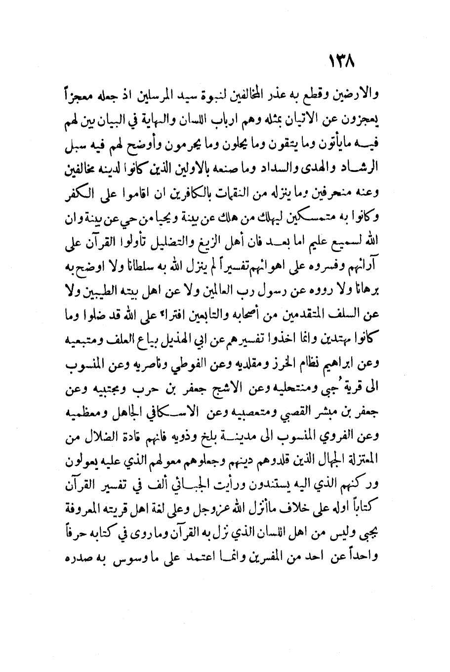 وَالْأَرضين وَقطع بِهِ عذر الْمُخَالفين لنبوة سيد الْمُرْسلين إِذْ جعله معجزًا يعجزون عَن الْإِتْيَان بِمثلِهِ وهم أَرْبَاب اللِّسَان وَالنِّهَايَة فِي الْبَيَان بَين لَهُم فِيهِ مَا يأْتونَ وَمَا يَتَّقُونَ وَمَا يحلونَ وَمَا يحرمُونَ وأوضح لَهُم فِيهِ سبل الرشاد وَالْهدى والسداد وَمَا صنعه بالأولين الَّذين كَانُوا لَدَيْهِ مخالفين وَعنهُ منحرفين وَمَا ينزله من النقمات بالكافرين إِن أَقَامُوا على الْكفْر وَكَانُوا بِهِ مُتَمَسِّكِينَ لِيَهْلِكَ مَنْ هَلَكَ عَنْ بَيِّنَةٍ ويحيا مَنْ حَيَّ عَنْ بَيِّنَةٍ وَإِنَّ الله لسميع عليم أما بعد فَإِن أهل الزيغ والتضليل تأولوا الْقُرْآن على آرائهم وفسروه على أهوائهم تَفْسِيرا لم ينزل الله بِهِ سُلْطَانا وَلَا أوضح بِهِ برهانًا وَلَا رَوَوْهُ عَن رَسُول رب الْعَالمين وَلَا عَن أهل بَيته الطيبين وَلَا عَن السّلف الْمُتَقَدِّمين من أَصْحَابه وَالتَّابِعِينَ افتراءً على اللَّه قَدْ ضلوا وَمَا كَانُوا مهتدين وَإِنَّمَا أخذُوا تفسيرهم عَنْ أَبِي الْهُذيْل بياع الْعلف ومتبعيه وَعَن إِبْرَاهِيم نظام الخرز ومقلديه وَعَن الفوطي ونَاصريه وَعَن الْمَنْسُوب إِلَى قَرْيَة جبي ومنتحليه وَعَن الْأَشَج جَعْفَر بن حَرْب ومجتبيه وَعَن جَعْفَر بن مُبشر القصبي ومتعصبيه وَعَن الإسكافي الْجَاهِل ومعظميه وَعَن الْفَروِي الْمَنْسُوب إِلَى مَدِينَة بَلخ وَذَوِيهِ فَإِنَّهُم قادة الضلال من الْمُعْتَزلَة الْجُهَّال الَّذين قلّدوهم دينهم وجعلوهم معولهم الَّذِي عَلَيْهِ يعولون وركنهم الَّذِي إِلَيْهِ يستندون وَرَأَيْت الجبائي ألف فِي تَفْسِير الْقُرْآن كتابا أوَّله على خلاف مَا أنزل الله عزوجل وعَلى لُغَة أهل قريته الْمَعْرُوفَة بجبي وَلَيْسَ من أهل اللِّسَان الَّذِي نزل بِهِ الْقُرْآن وَمَا روى فِي كِتَابه حرفا وَاحِدًا عَن أحدٍ من الْمُفَسّرين وَإِنَّمَا اعْتمد على مَا وسوس بِهِ صَدره