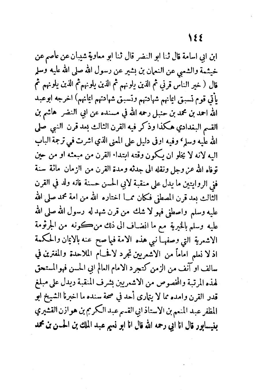 خَيْرُ النَّاسِ قَرْنِي ثُمَّ الَّذِينَ يَلُونَهُمْ ثُمَّ الَّذِينَ يَلُونَهُمْ ثُمَّ الَّذِينَ يَلُونَهُمْ ثمَّ يأتى يقوم تَسْبِقُ أَيْمَانُهُمْ شَهَادَتَهُمْ وَتَسْبِقُ شَهَادَتُهُمْ أَيْمَانَهُمْ أَخْرَجَهُ أَبُو عَبْدِ اللَّهِ أحمج بْنُ مُحَمَّدِ بْنِ حَنْبَلٍ رَحِمَهُ اللَّهُ فِي مُسْنَدِهِ عَنْ أَبِي النَّضر هَاشم بن الْقسم الْبَغْدَادِيِّ هَكَذَا وَذَكَرَ فِيهِ الْقَرْنَ الثَّالِثَ بَعْدَ قَرْنِ النَّبِيِّ صَلَّى اللَّهُ عَلَيْهِ وَسَلَّمَ وَفِيه أوفى دَلِيل على الْمَعْنى الَّذِي أَشرت فِي تَرْجَمَة الْبَاب إِلَيْهِ لِأَنَّهُ لَا يَخْلُو أَن يكون وقته ابْتِدَاء الْقرن من مبعثه أَو من حِين توفاه الله عزوجل وَنَقله إِلَى جدته وَمُدَّة الْقرن من الزَّمَان مائَة سنة فَفِي الرِّوَايَتَيْنِ مَا يدل على منقبة لأبي الْحسن حَسَنَة فَإِنَّهُ ولد فِي الْقرن الثَّالِث بعد قرن الْمُصْطَفى فَكَانَ مِمَّا اخْتَارَهُ اللَّه من أمة مُحَمَّد صَلَّى اللَّهُ عَلَيْهِ وَسَلَّمَ وَاصْطفى فَهُوَ لَا شكّ من قرن شهد لَهُ رَسُول اللَّه صَلَّى الله عَلَيْهِ سلم بالخيرية مَعَ مَا انضاف إِلَى ذَلِك من كَونه من الجرثومة الأشعرية الَّتِي وصفهَا نَبِي هَذِهِ الْأمة فِيمَا صَحَّ عَنهُ بِالْإِيمَان وَالْحكمَة إِذْ لَا نعلم إِمَامًا من الْأَشْعَرِيين تجرد لَا فحام الْمَلَاحِدَة والمفترين فِي سالف أَو آنف من الزَّمن كتجرد الإِمَام الْعَالم أَبِي الْحسن فَهُوَ الْمُسْتَحق لهَذِهِ الْمرتبَة والمخصوص من الْأَشْعَرِيين بشرف المنقبة وَيدل على مبلغ قدر الْقرن وأمده مِمَّا لَا يتمارى أحد فِي صِحَة سَنَده مَا أَخْبَرَنَا الشَّيْخُ أَبُو الْمُظَفَّرِ عَبْدُ الْمُنْعِمِ بْنُ الأُسْتَاذِ أَبِي الْقسم عَبْدِ الْكَرِيم بن هوَازن الْقشيرِي بنيسابور قَالَ أَنا ابي رَحمَه الله قَالَ أَنا أَبُو نُعَيْمٍ عَبْدُ الْمَلِكِ بْنِ الْحَسَنِ بْنِ مُحَمَّدٍ