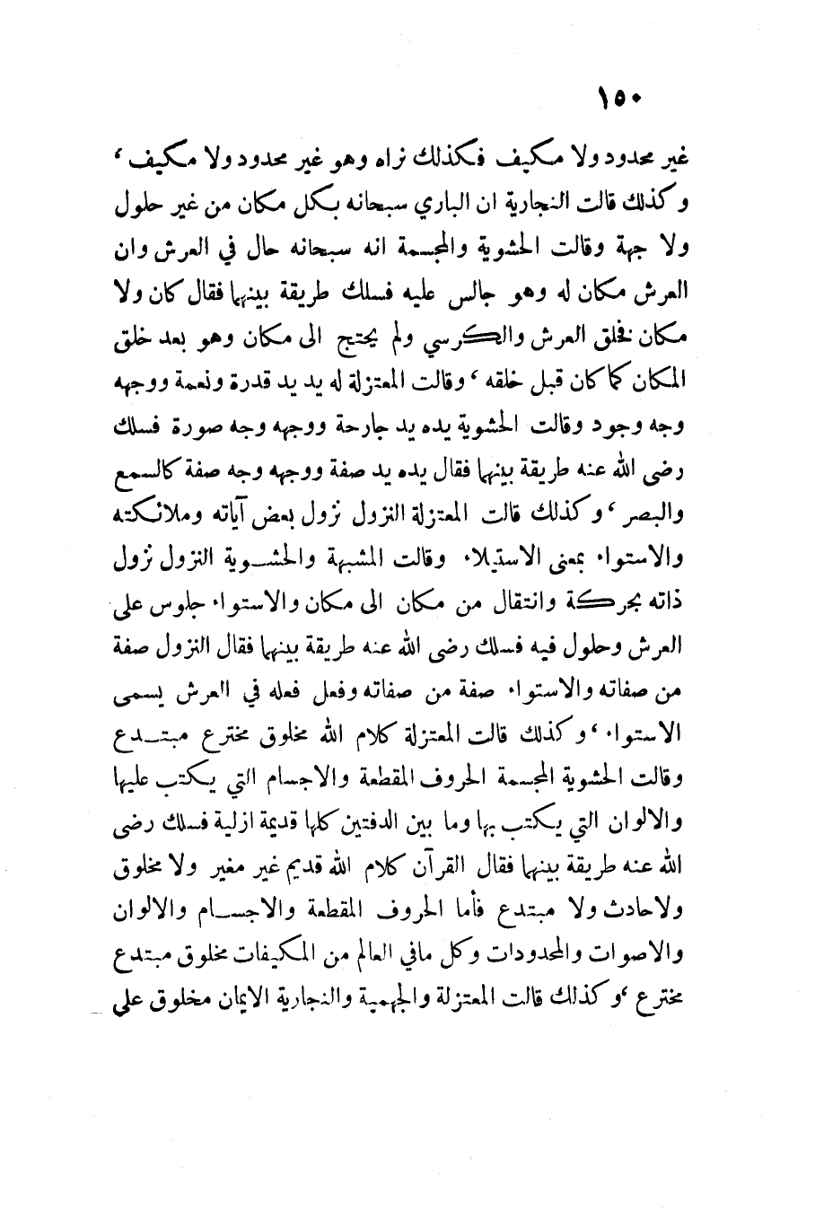 غير مَحْدُود وَلَا مكيف فَكَذَلِك نرَاهُ وَهُوَ غير مَحْدُود وَلَا مكيف وَكَذَلِكَ قَالَت النجارية إِن الْبَارِي سُبْحَانَهُ بِكُل مَكَان من غير حُلُول وَلَا جِهَة وَقَالَت الحشوية والمجسمة إِنَّه سُبْحَانَهُ حَال فِي الْعَرْش وَإِن الْعَرْش مَكَان لَهُ وَهُوَ جَالس عَلَيْهِ فسلك طَريقَة بَينهمَا فَقَالَ كَانَ وَلَا مَكَان فخلق الْعَرْش والكرسي وَلم يحْتَج إِلَى مَكَان وَهُوَ بعد خلق الْمَكَان كَمَا كَانَ قبل خلقه وَقَالَت الْمُعْتَزلَة لَهُ يَد يَد قدرَة ونعمة وَوَجهه وَجه وجود وَقَالَت الحشوية يَده يَد جارحة وَوَجهه وَجه صُورَة فسلك رَضِيَ اللَّهُ عَنْهُ طَريقَة بَينهمَا فَقَالَ يَده يَد صفة وَوَجهه وَجه صفة كالسمع وَالْبَصَر وَكَذَلِكَ قَالَت الْمُعْتَزلَة النُّزُول نزُول بعض آيَاته وَمَلَائِكَته والاستواء بمعني الِاسْتِيلَاء وَقَالَت المشبهة والحشوية النُّزُول نزُول ذَاته بحركة وانتقال من مَكَان إِلَى مَكَان والاستواء جُلُوس على الْعَرْش وحلول فِيهِ فسلك رَضِيَ اللَّهُ عَنْهُ طَريقَة بَينهمَا فَقَالَ النُّزُول صفة من صِفَاته والإستواء وَكَذَلِكَ قَالَت الْمُعْتَزلَة كَلَام اللَّه مَخْلُوق مخترع مُبْتَدع وَقَالَت الحشوية المجسمة الْحُرُوف الْمُقطعَة والأجسام الَّتِي يكْتب عَلَيْهَا والألوان الَّتِي يكْتب بهَا وَمَا بَين الدفتين كلهَا قديمَة أزلية فسلك رَضِيَ اللَّهُ عَنْهُ طَريقَة بَينهمَا فَقَالَ الْقُرْآن كَلَام اللَّه قديم غير مغير وَلَا مَخْلُوق وَلَا حَادث وَلَا مُبْتَدع فَأَما الْحُرُوف الْمُقطعَة والأجسام والألوان والأصوات والمحدودات وكل مَا فِي الْعَالم من المكيفات مَخْلُوق مُبْتَدع مخترع وَكَذَلِكَ قَالَت الْمُعْتَزلَة والجهمية والنجارية الْإِيمَان مَخْلُوق على