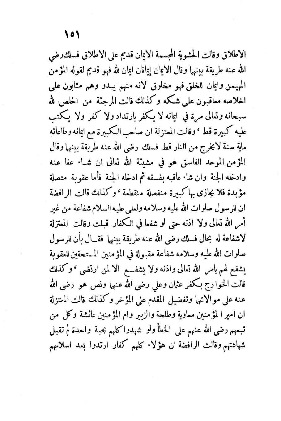 الْإِطْلَاق وَقَالَت الحشوية المجسمة الْإِيمَان قديم على الْإِطْلَاق فسلك رَضِيَ اللَّهُ عَنْهُ طَريقَة بَينهمَا وَقَالَ الْإِيمَان إيمانَان إِيمَان لِلَّه فَهُوَ قديم لقَوْله الْمُؤمن الْمُهَيْمِن وإيمان لِلْخلقِ فَهُوَ مَخْلُوق لِأَنَّهُ مِنْهُم يَبْدُو وهم مثابون على إخلاصه معاقبون على شكه وَكَذَلِكَ قَالَت المرجئة من أخْلص لِلَّه سُبْحَانَهُ وَتَعَالَى مرّة فِي إيمَانه لَا يكفر بارتداد وَلَا كفر وَلَا يكْتب عَلَيْهِ كَبِيرَة قطّ وَقَالَت الْمُعْتَزلَة إِن صَاحب الْكَبِيرَة مَعَ إيمَانه وطاعاته ماية سنة لَا يخرج من النَّار قطّ فسلك رَضِيَ اللَّهُ عَنْهُ طَريقَة بَينهمَا وَقَالَ الْمُؤمن الموحد الْفَاسِق هُوَ فِي مَشِيئَة اللَّه تَعَالَى إِن شَاءَ عَفا عَنهُ وَأدْخلهُ الْجنَّة وَإِن شَاءَ عاقبه بِفِسْقِهِ ثمَّ أدخلهُ الْجنَّة فَأَما عُقُوبَة مُتَّصِلَة مُؤَبّدَة فَلَا يجازى بهَا كَبِيرَة مُنْفَصِلَة مُنْقَطِعَة وَكَذَلِكَ قَالَت الرافضة إِن للرسول صلوَات اللَّه عَلَيْهِ وَسَلَامه ولعلي عَلَيْهِ السَّلَام شَفَاعَة من غير أَمر اللَّه تَعَالَى وَلَا إِذْنه حَتَّى لَو شفعا فِي الْكفَّار قبلت وَقَالَت الْمُعْتَزلَة لَا شَفَاعَة لَهُ بِحَال فسلك رَضِيَ اللَّهُ عَنْهُ طَريقَة بَينهمَا فَقَالَ بِأَن للرسول صلوَات اللَّه عَلَيْهِ وَسَلَامه شَفَاعَة مَقْبُولَة فِي الْمُؤمنِينَ الْمُسْتَحقّين للعقوبة يشفع لَهُم بِأَمْر اللَّه تَعَالَى وإذنه وَلَا يشفع إِلَّا لمن ارتضي وَكَذَلِكَ قَالَت الْخَوَارِج بِكفْر عُثْمَان وعَلِيٍّ رَضِيَ اللَّهُ عَنْهُما وَنَصّ هُوَ رَضِيَ اللَّهُ عَنْهُ على موالاتهما وتفضيل الْمُقدم على الْمُؤخر وَكَذَلِكَ قَالَت الْمُعْتَزلَة إِن أَمِير الْمُؤمنِينَ مُعَاوِيَة وَطَلْحَة وَالزُّبَيْر وَأم الْمُؤمنِينَ عَائِشَة وكل من تَبِعَهُمْ رَضِيَ اللَّهُ عَنْهُم على الْخَطَأ وَلَو شهدُوا كلهم بِحَبَّة وَاحِدَة لم تقبل شَهَادَتهم وَقَالَت الرافضة إِن هَؤُلَاءِ كلهم كفار ارْتَدُّوا بعد إسْلَامهمْ