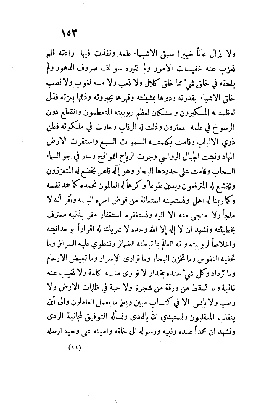 وَلَا يزَال عَالما خَبِيرا سبق الإشياء علمه ونفذت فِيهَا إِرَادَته فَلم تعزب عَنهُ خفيات الْأُمُور وَلم تغيره سوالف صروف الدهور وَلم يلْحقهُ فِي خلق شَيْء مِمَّا خلق كلال وَلَا تَعب وَلَا مَسّه لغوب وَلَا نصب خلق الْأَشْيَاء بقدرته ودبرها بمشيئته وقهرها بجبروته وذللها بعزته فذل لعظمته المتكبرون واستكان لعظم ربوبيته المتعظمون وَانْقطع دون الرسوخ فِي علمه الممترون وذلت لَهُ الرّقاب وحارت فِي ملكوته فِطَن ذَوي الْأَلْبَاب وَقَامَت بكلمته السَّمَوَات السَّبع واستقرت الأَرْض المهاد وَثبتت الْجبَال الرواسِي وَجَرت الرِّيَاح اللواقح وَسَار فِي جو السَّمَاء السَّحَاب وَقَامَت على حُدُودهَا الْبحار وَهُوَ إِلَه قاهر يخضع لَهُ المتعززون ويخشع لَهُ المترفعون ويدين طَوْعًا وَكرها لَهُ الْعَالمُونَ نحمده كَمَا حمد نَفسه وكما رَبُّنَا لَهُ أهل ونستعينه استعانة من فوَّض أمره إِلَيْهِ وَأقر أَنه لَا ملْجأ وَلَا منجى مِنْهُ إِلَّا إِلَيْهِ وَنَسْتَغْفِرهُ اسْتِغْفَار مقرّ بِذَنبِهِ معترف بخطيئته ونشهد أَن لَا إِلَه إِلَّا اللَّه وَحده لَا شريك لَهُ إِقْرَارا بوحدانيته وإخلاصا لربوبيته وَأَنه الْعَالم بِمَا تبطنه الضمائر وتنطوي عَلَيْهِ السرائر وَمَا تخفيه النُّفُوس وَمَا تخزن الْبحار وَمَا تواري الْأَسْرَار وَمَا تَغِيضُ الأَرْحَامُ وَمَا تَزْدَادُ وَكُلُّ شَيْءٍ عِنْدَهُ بِمِقْدَار لَا توارى مِنْهُ كلمة وَلَا تغيب عَنهُ غَائِبَة وَمَا تسْقط من ورقة من شَجَرَة وَلا حَبَّةٍ فِي ظُلُمَاتِ الأَرْضِ وَلا رَطْبٍ وَلا يَابِسٍ إِلا فِي كتاب مُبين وَيعلم مَا يعْمل الْعَامِلُونَ وَإِلَى أَيْن يَنْقَلِب المنقلبون ونستهدي اللَّه بِالْهدى ونسأله التَّوْفِيق لمجانبة الردى ونشهد أَن مُحَمَّدًا عَبده وَنبيه وَرَسُوله إِلَى خلقه وأمينه على وحيه أرْسلهُ