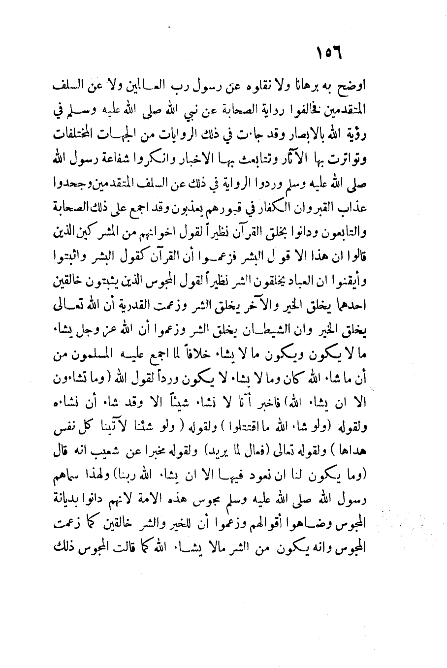 أوضح بِهِ برهانًا وَلَا نقلوه عَن رَسُول رب الْعَالمين وَلَا عَن السّلف الْمُتَقَدِّمين فخالفوا رِوَايَة الصَّحَابَة عَن نَبِي اللَّه صَلَّى اللَّهُ عَلَيْهِ وَسَلَّمَ فِي رُؤْيَة اللَّه بالأبصار وَقد جَاءَت فِي ذَلِك الرِّوَايَات من الْجِهَات المختلفات وتواترت بهَا الْآثَار وَتَتَابَعَتْ بهَا الْأَخْبَار وأنكروا شَفَاعَة رَسُولُ اللَّهِ صَلَّى اللَّهُ عَلَيْهِ وَسَلَّمَ وردوا الرِّوَايَة فِي ذَلِك عَن السّلف الْمُتَقَدِّمين وجحدوا عَذَاب الْقَبْر وَأَن الْكفَّار فِي قُبُورهم يُعَذبُونَ وَقد أجمع على ذَلِك الصَّحَابَة والتابعون ودانوا بِخلق الْقُرْآن نظيرا لقَوْل إخْوَانهمْ من الْمُشْركين الَّذين قَالُوا إِنْ هَذَا إِلا قَول الْبشر فزعموا أَن الْقُرْآن كَقَوْل الْبشر وأثبتوا وأيقنوا أَن الْعباد يخلقون الشَّرّ نظيرا لقَوْل الْمَجُوس الَّذين يثبتون خالقين أَحدهمَا يخلق الْخَيْر وَالْآخر يخلق الشَّرّ وَزَعَمت الْقَدَرِيَّة ان الله تَعَالَى يخلق الْخَيْر وَأَن الشَّيْطَان يخلق الشَّرّ وَزَعَمُوا ان الله عزوجل يَشَاء مَا لَا يكون وَيكون مَا لَا يَشَاء خلافًا لما أجمع عَلَيْهِ الْمُسلمُونَ من أَن مَا شَاءَ اللَّه كَانَ وَمَا لَا يَشَاء لَا يكون وردا لقَوْل الله {وَمَا تشاؤون إِلَّا أَن يَشَاء الله} فَأخْبر أنَّا لَا نشَاء شَيْئا إِلَّا وَقد شَاءَ أَن نشاءه وَلقَوْله {وَلَوْ شَاءَ اللَّهُ مَا اقْتَتَلُوا} وَلقَوْله {وَلَوْ شِئْنَا لآتَيْنَا كُلَّ نفس هداها} وَلقَوْله تَعَالَى {فَعَّالٌ لِمَا يُرِيدُ} وَلقَوْله مخبرا عَن شُعَيْب أَنه قَالَ {وَمَا يَكُونُ لَنَا أَنْ نَعُودَ فِيهَا إِلا أَنْ يَشَاءَ الله رَبنَا} وَلِهَذَا سماهم رَسُول اللَّه صَلَّى اللَّهُ عَلَيْهِ وَسَلَّمَ مجوس هَذِهِ الْأمة لأَنهم دانو بديانة الْمَجُوس وضاهوا أَقْوَالهم وَزَعَمُوا أنَّ للخير وَالشَّر خالقين كَمَا زعمت الْمَجُوس وَأَنه يكون من الشَّرّ مَالا يَشَاء كَمَا قَالَت الْمَجُوس ذَلِك