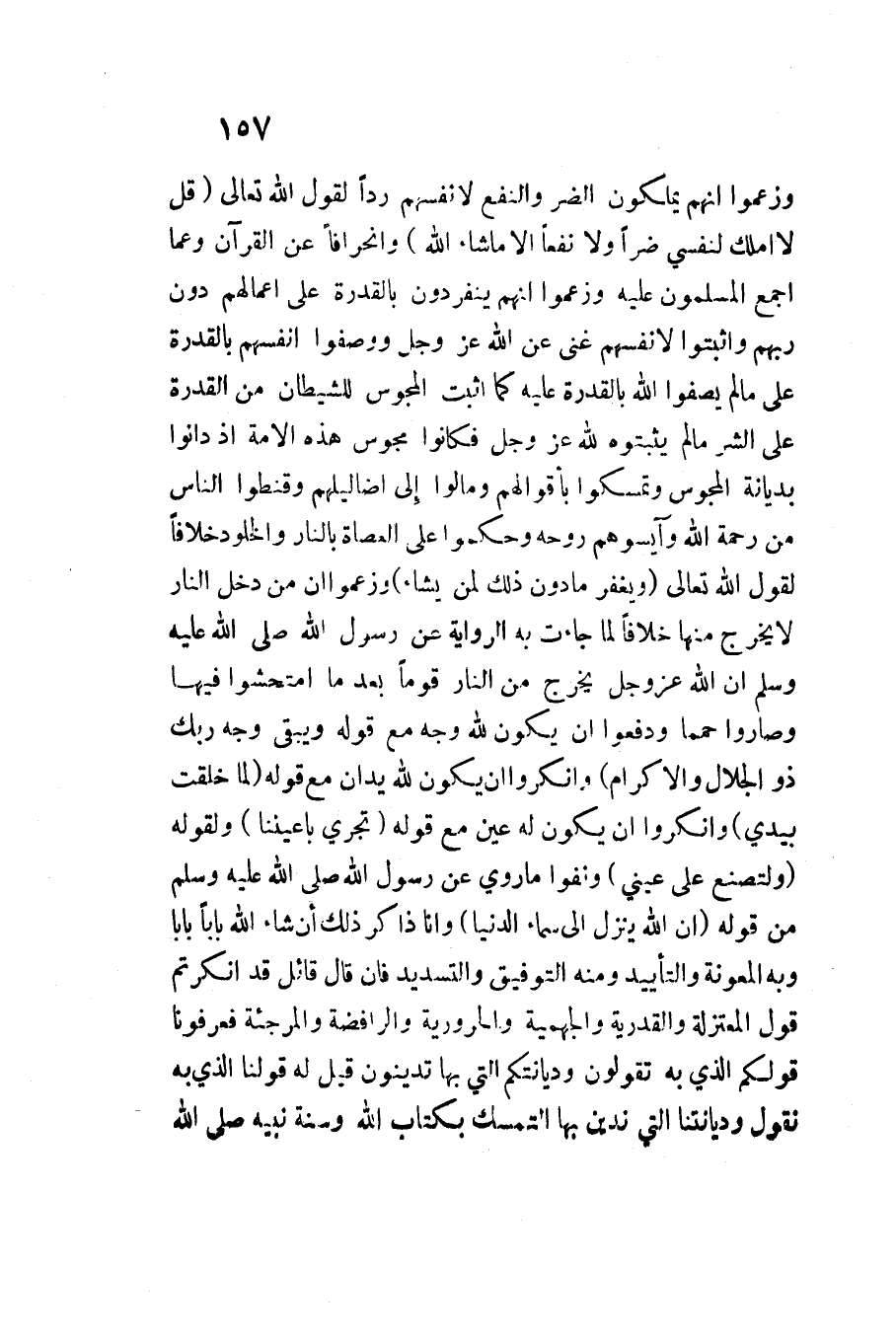 وَزَعَمُوا أَنهم يملكُونَ الضّر والنفع لأَنْفُسِهِمْ ردا لقَوْل اللَّه تَعَالَى {قُلْ لَا أَمْلِكُ لِنَفْسِي ضَرًّا وَلا نَفْعًا إِلا مَا شَاءَ الله} وانحرافا عَن الْقُرْآن وَعَما أجمع الْمُسلمُونَ عَلَيْهِ وَزَعَمُوا أَنهم ينفردون بِالْقُدْرَةِ على أَعْمَالهم دون رَبهم وأثبتوا لأَنْفُسِهِمْ غنى عَن اللَّه عزوجل ووصفوا أنفسهم بِالْقُدْرَةِ على مَا لم يصفوا اللَّه بِالْقُدْرَةِ عَلَيْهِ كَمَا أثبت الْمَجُوس للشَّيْطَان من الْقُدْرَة على الشَّرّ مَا لم يثبتوه لله عزوجل فَكَانُوا مجوس هَذِه الْأمة إِذْ دانوا بديانة الْمَجُوس وتمسكوا بأقوالهم ومالوا إِلَى أضاليلهم وقنطوا النَّاس من رَحْمَة الله وآيسوهم روحه وحكموا على العصاة بالنَّار وَالْخُلُود خلافًا لقَوْل اللَّه تَعَالَى {وَيَغْفِرُ مَا دُونَ ذَلِكَ لِمَنْ يَشَاء} وَزَعَمُوا أَن من دخل النَّار لَا يخرج مِنْهَا خلافًا لما جَاءَت بِهِ الرِّوَايَة عَن رَسُول اللَّهِ صَلَّى اللَّهُ عَلَيْهِ وَسَلَّمَ ان الله عزوجل يخرج من النَّار قوما بعد مَا امْتَحَشُوا فِيهَا وَصَارُوا حِمَمًا ودفعوا أَن يكون لِلَّه وَجه مَعَ قَوْله {وَيَبْقَى وَجْهُ رَبِّكَ ذُو الْجلَال وَالْإِكْرَام} وأنكروا أَن يكون لِلَّه يدان مَعَ قَوْله {لِمَا خَلَقْتُ بِيَدَيَّ} وأنكروا أَن يكون لَهُ عين مَعَ قَوْله {تجْرِي بأعيننا} وَلقَوْله {ولتصنع على عَيْني} وَنَفَوْا مَا رُوِيَ عَن رَسُول اللَّهِ صَلَّى اللَّهُ عَلَيْهِ وَسَلَّمَ من قَوْله إِنَّ اللَّهَ يَنْزِلُ إِلَى سَمَاء الدني وأنَا ذَاكر ذَلِك إِن شَاءَ الله بَابا بَابا وَبِه المهونة والتأييد وَمِنْه التَّوْفِيق والتسديد فَإِن قَالَ قَائِل قد أنكرتم قَول الْمُعْتَزلَة والقدرية والجهمية والحرورية والرافضة والمرجئة فعرفونَا قَوْلكُم الَّذِي بِهِ تَقولُونَ وديانتكم الَّتِي بهَا تدينون قيل لَهُ قولنَا الَّذِي بِهِ تَقول وديانتنَا الَّتِي ندين بهَا التَّمَسُّك بِكِتَاب اللَّه وَسنة نبيه صَلَّى اللَّهُ