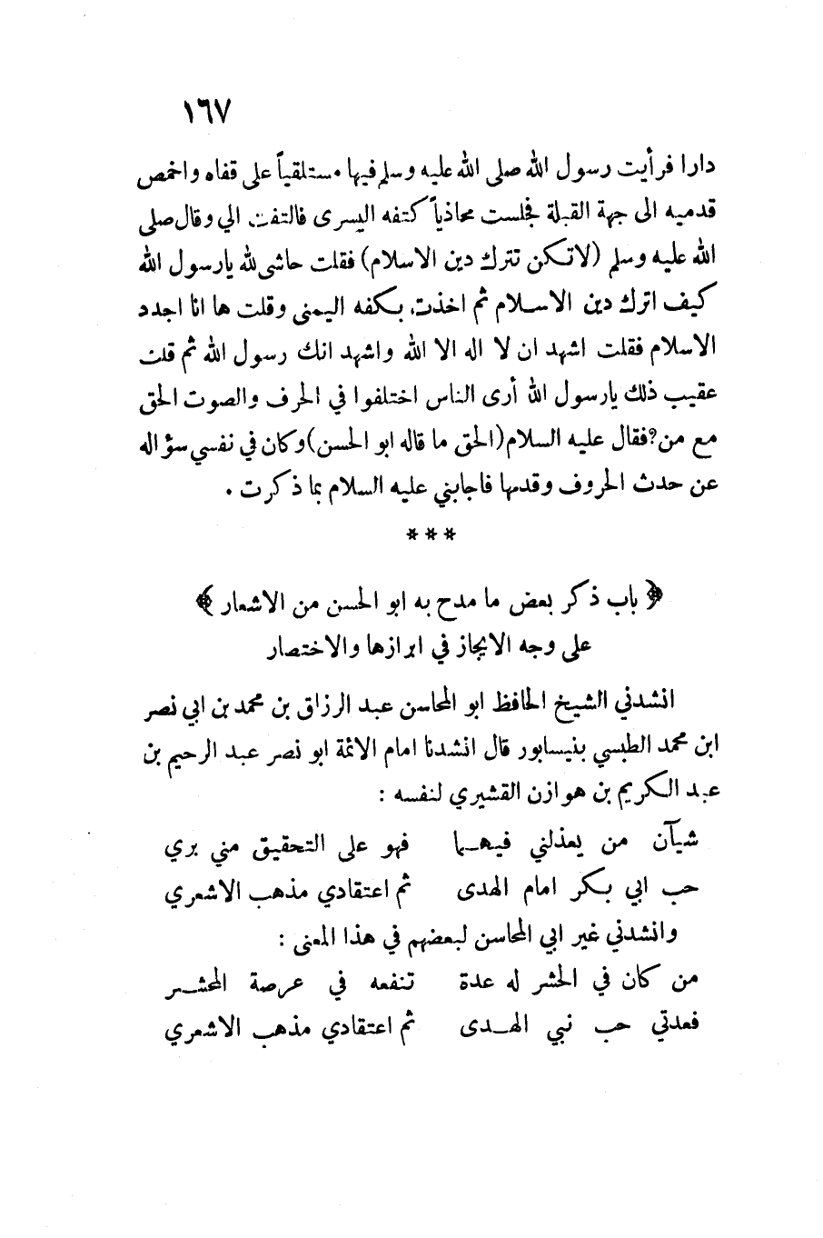 أَنْشدني الشَّيْخ الْحَافِظ أَبُو المحاسن عبد الرَّزَّاق بْنُ مُحَمَّدِ بْنِ أَبِي نَصْرٍ ابْن مُحَمَّد الطبسي بِنَيْسَابُورَ قَالَ أنشدنَا إِمَام الْأَئِمَّة أَبُو نصر عبد الرَّحِيم بن عَبْدِ الْكَرِيم بن هوَازن الْقشيرِي لنَفسِهِ ... شيآن من يعذلني فيهمَا
