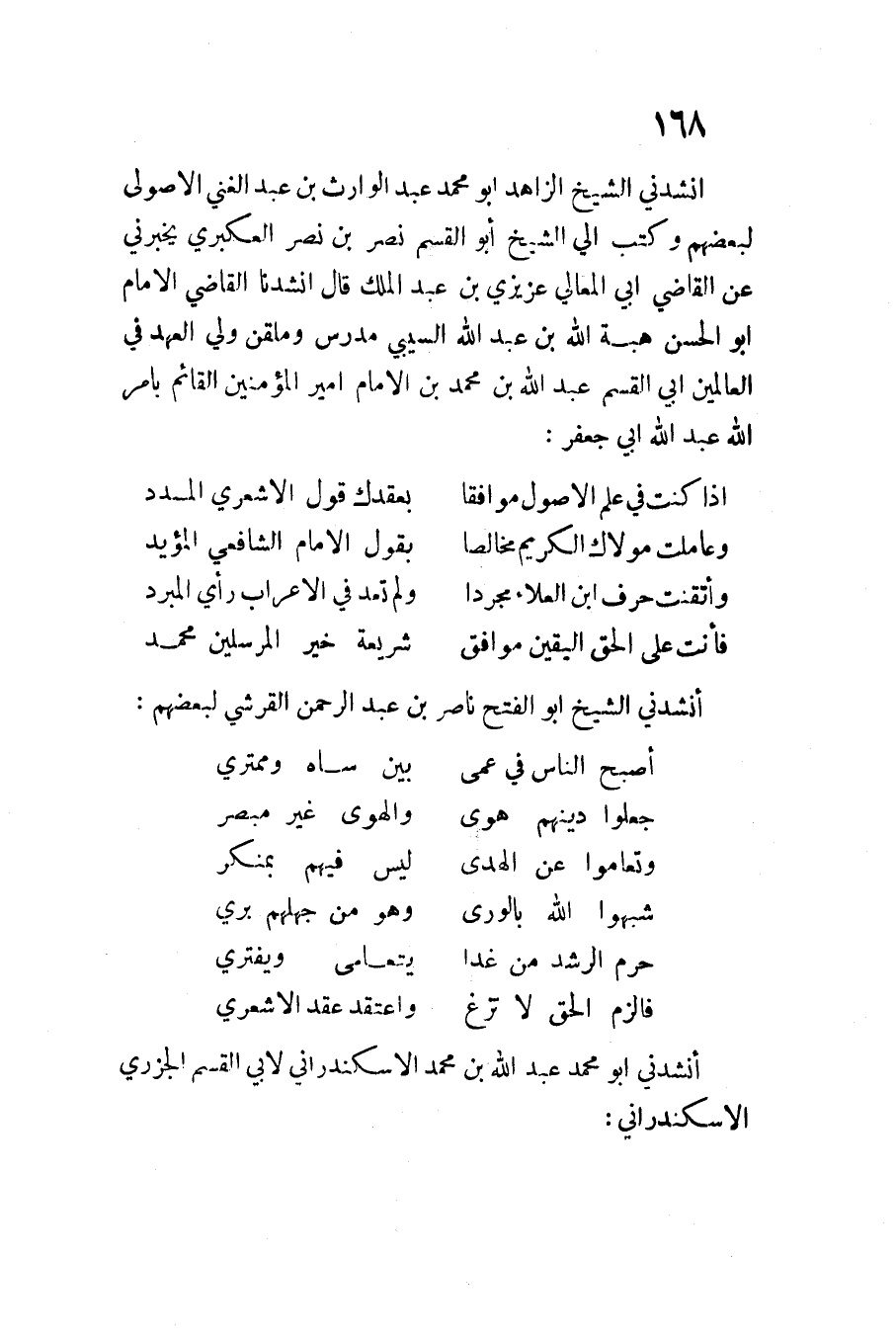 أَنْشدني الشَّيْخ الزَّاهِد أَبُو مُحَمَّدٍ عَبْدُ الْوَارِث بن عَبْدِ الْغَنِيّ الأصولي لبَعْضهِم وَكتب إليَّ الشَّيْخ أَبُو الْقسم نصر بن نصر العكبري يُخْبِرنِي عَن الْقَاضِي أَبِي الْمَعَالِي عزيزي بن عَبْدِ الْمَلِكِ قَالَ أنشدنَا الْقَاضِي الإِمَام أَبُو الْحَسَنِ هِبَة اللَّهِ بن عَبْدِ اللَّهِ السيبي مدرس وملقن ولي الْعَهْد فِي الْعَالمين أبي الْقسم عَبْدُ اللَّهِ بْنُ مُحَمَّدِ بْنِ الإِمَام أَمِير الْمُؤمنِينَ الْقَائِم بِأَمْر اللَّه عَبْد اللَّهِ أَبِي جَعْفَر ... إِذَا كنت فِي علم الْأُصُول مُوَافقا