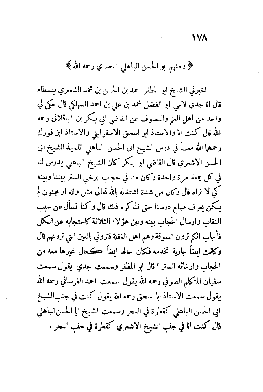 أَخْبَرنِي الشَّيْخ أَبُو المظفر أَحْمد بن الْحَسَنِ بن مُحَمَّد الشعيري ببسطام قَالَ أَنا جَدِّي لأُمِّي أَبُو الْفَضْلِ مُحَمَّدُ بْنُ عَلِيِّ بْنِ أَحْمَدَ السَّهْلَكِيُّ قَالَ حكى لي وَاحِد من أهل الْعلم والتصوف عَن الْقَاضِي أَبِي بكر بن الباقلاني رَحمَه اللَّه قَالَ كنت أنَا والأستاذ أَبُو إِسْحَق الاسفرايني والأستاذ ابْن فورك رحمهمَا اللَّه مَعًا فِي درس الشَّيْخ أَبِي الْحسن الْبَاهِلِيّ تلميذ الشَّيْخ أَبِي الْحسن الْأَشْعَرِيّ قَالَ الْقَاضِي أَبُو بكر كَانَ الشَّيْخ الْبَاهِلِيّ يدرس لنَا فِي كل جُمُعَة مرّة وَاحِدَة وَكَانَ منَّا فِي حجاب يُرْخِي السّتْر بيننَا وَبَينه كي لَا نرَاهُ قَالَ وَكَانَ من شدَّة اشْتِغَاله بِاللَّهِ تَعَالَى مثل واله أَو مَجْنُون لم يكن يعرف مبلغ درسنَا حَتَّى نذكرهُ ذَلِك قَالَ وكنَّا نسْأَل عَن سَبَب النقاب وإرسال الْحجاب بَينه وَبَين هَؤُلَاءِ الثَّلَاثَة كاحتجابه عَن الْكل فَأجَاب إِنَّكُم ترَوْنَ السوقة وهم أهل الْغَفْلَة فتروني بِالْعينِ الَّتِي ترونهم قَالَ وَكَانَت أَيْضا جَارِيَة تخدمه فَكَانَ حَالهَا أَيْضا كَحال غَيرهَا مَعَه من الْحجاب وإرخائه السّتْر قَالَ أَبُو المظفر وَسمعت جدي يَقُول سَمِعت سُفْيَان الْمُتَكَلّم الصُّوفِي رَحمَه اللَّه يَقُول سَمِعت أَحْمد الفرساني رَحمَه اللَّه يَقُول سَمِعت الْأُسْتَاذ أَبَا إِسْحَق رَحمَه اللَّه يَقُول كنت فِي جنب الشَّيْخ أَبِي الْحسن الْبَاهِلِيّ كقطرة فِي الْبَحْر وَسمعت الشَّيْخ أَبَا الْحسن الْبَاهِلِيّ قَالَ كنت أنَا فِي جنب الشَّيْخ الْأَشْعَرِيّ كقطرة فِي جنب الْبَحْر