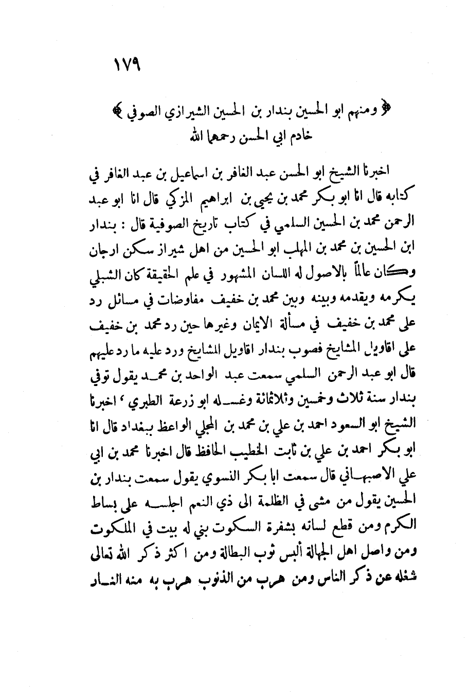وَمِنْهُم أَبُو الْحُسَيْنِ بُنْدار بن الْحُسَيْنِ الشِّيرَازِيّ الصُّوفِي خَادِم أَبِي الْحسن رحمهمَا اللَّه
