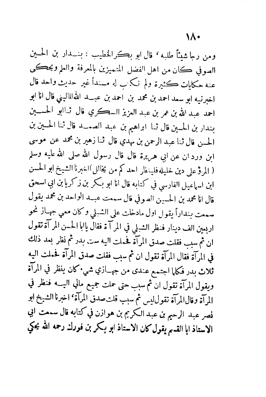 وَمن رجا شَيْئا طلبه قَالَ أَبُو بَكْرٍ الْخَطِيبُ بُنْدَارُ بْنُ الْحُسَيْنِ الصُّوفِيُّ كَانَ مِنْ أَهْلِ الْفضل المتميزين بالمعرفة وَالْعلم ويحكى عَنْهُ حِكَايَاتٌ كَثِيرَةٌ وَلَمْ نَكْتُبْ لَهُ مُسْنَدًا غَيْرَ حَدِيثٍ وَاحِدٍ قَالَ أَخْبَرنِيهِ أَبُو سَعْدٍ أَحْمَدُ بْنُ مُحَمَّدِ بْنِ أَحْمَدَ بْنِ عبد الله الْمَالِينِي قَالَ أَنا أَبُو أَحْمَدَ عَبْدُ اللَّهِ بْنُ عُمَرَ بْنِ عَبْدِ الْعَزِيزِ السُّكَّرِّيُّ قَالَ ثَنَا أَبُو الْحُسَيْنِ بُنْدار بن الْحُسَيْنِ قَالَ ثَنَا إِبْرَاهِيمُ بْنُ عَبْدِ الصَّمَدِ قَالَ ثَنَا الْحُسَيْن بن الْحسن قَالَ ثَنَا عَبْدُ الرَّحْمَنِ بْنُ مَهْدِيٍّ قَالَ ثَنَا زُهَيْرُ بْنُ مُحَمَّدٍ عَنْ مُوسَى ابْن وَرْدَانَ عَنْ أَبِي هُرَيْرَةَ قَالَ قَالَ رَسُولُ اللَّهِ صَلَّى اللَّهُ عَلَيْهِ وَسلم المرؤ عَلَى دِينِ خَلِيلِهِ فَلْيَنْظُرْ أَحَدُكُمْ مَنْ يُخَالِلُ أَخْبَرَنَا الشَّيْخُ أَبُو الْحسن ابْن إِسْمَاعِيلَ الْفارسي فِي كِتَابه قَالَ أَنا أَبُو بكر بن زَكَرِيَّا بن أبي اسحق قَالَ أَنا مُحَمَّدُ بْنُ الْحُسَيْنِ الصُّوفِي قَالَ سَمِعت عبد الْوَاحِد بن مُحَمَّد يَقُول سَمِعت بندارا يَقُول أول مَا دخلت على الشبلي وَكَانَ معي جهاز نَحْو أَرْبَعِينَ ألف دينَار فَنظر الشبلي فِي الْمرْآة فَقَالَ يَا أَبَا الْحسن الْمرْآة تَقول إِن ثَمَّ سَبَب فَقلت صدق الْمرْآة فَحملت إِلَيْهِ سِتّ بدر ثمَّ نظر بعد ذَلِك فِي الْمرْآة تَقول إِن ثَمَّ سَبَب فَقلت صدق الْمرْآة فَحملت إِلَيْهِ ثَلَاث بدر فَكلما اجْتمع عِنْدِي من جهازي شَيْء كَانَ ينظر فِي الْمرْآة وَيَقُول الْمرْآة تَقول إِن ثمَّ سَبَب حَتَّى حملت جَمِيع مَالِي إِلَيْهِ فَنظر فِي الْمرْآة وَقَالَ الْمرْآة تَقول لَيْسَ ثمَّ من سَبَب قلت صدق الْمرْآة أَخْبَرَنَا الشَّيْخُ أَبُو نصر عبد الرَّحِيم بن عبد الْكَرِيم بن هوزان فِي كِتَابه قَالَ سَمِعت أَبِي الْأُسْتَاذ أَبَا الْقسم يَقُول كَانَ الْأُسْتَاذ أَبُو بكر بن فورك رَحمَه اللَّه يَحْكِي