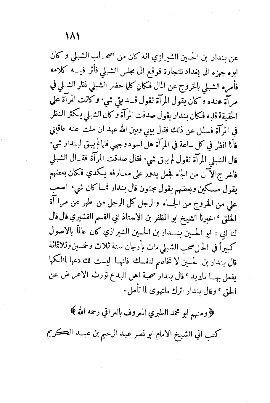 عَن بنْدَار بن الْحُسَيْنِ الشِّيرَازِيّ أَنه كَانَ من أَصْحَاب الشبلي وَكَانَ أَبُوه جهزه إِلَى بَغْدَاد للتِّجَارَة فَوَقع إِلَى مجْلِس الشبلي فأثر فِيهِ كَلَامه فَأمره الشبلي بِالْخرُوجِ عَن المَال فَكَانَ كلما حضر الشبلي نظر الشبلي فِي مرْآة عِنْده وَكَانَ يَقُول الْمرْآة تَقول قد بَقِي شَيْء وَكَانَت الْمرْآة على الْحَقِيقَة قلبه فَكَانَ بنْدَار يَقُول صدقت الْمرْآة وَكَانَ الشبلي يكثر النّظر فِي الْمرْآة فَسئلَ عَن ذَلِك فَقَالَ بيني وَبَين اللَّه عهد إِن ملت عَنهُ عاقبَنِي فأنَا أنظر فِي كل سَاعَة فِي الْمرْآة هَل أسود وَجْهي فَلَمَّا لم يبْقى لبندار شَيْء قَالَ الشبلي الْمرْآة تَقول لم يبْق شَيْء فَقَالَ صدقت الْمرْآة فَقَالَ الشبلي فَاخْرُج الْآن من الجاه فَجعل يَدُور على معارفه يكدي فَكَانَ بَعضهم يَقُول مِسْكين وَبَعْضهمْ يَقُول مَجْنُون قَالَ بنْدَار فَمَا كَانَ شَيْء أصعب عليَّ من الْخُرُوج من الجاه وَالرجل كل الرجل من طَهُر عَن مرْآة الْخلق أَخْبَرَنَا الشَّيْخُ أَبُو الْمُظَفَّرِ بْنُ الْأُسْتَاذ أبي الْقسم الْقشيرِي قَالَ قَالَ لنَا أَبِي أَبُو الْحُسَيْنِ بُنْدار بن الْحُسَيْنِ الشِّيرَازِيّ كَانَ عَالما بالأصول كَبِيرا فِي الْحَال صحب الشبلي مَاتَ بأرجان سنة ثَلَاث وَخمسين وثلاثمائة قَالَ بنْدَار بن الْحُسَيْنِ لَا تخاصم لنَفسك فَإِنَّهَا لَيست لَك دعها لمَالِكهَا يفعل بهَا مَا يُرِيد قَالَ بنْدَار صُحْبَة أهل الْبدع تورث الْإِعْرَاض عَن الْحق وَقَالَ بنْدَار اترك مَا تهوى لما تَأمل