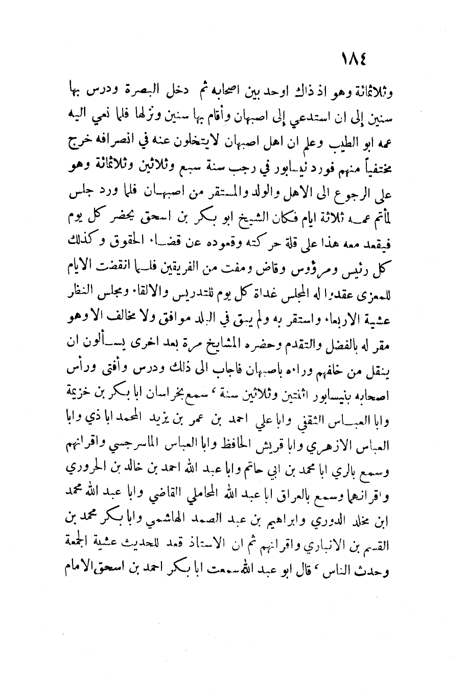 وثلاثمائة وَهُوَ إِذْ ذَاك أوحد بَين أَصْحَابه ثمَّ دخل الْبَصْرَة ودرس بهَا سِنِين إِلَى أَن استدعي إِلَى أَصْبَهَان وَأقَام بهَا سِنِين ونزلها فَلَمَّا نعي إِلَيْهِ عَمه أَبُو الطّيب وَعلم أَن أهل أَصْبَهَان لَا يتخلون عَنهُ فِي انْصِرَافه خرج مختفيا مِنْهُم فورد نيسابور فِي رَجَب سنة سبع وَثَلَاثِينَ وثلاثمائة وَهُوَ على الرُّجُوع إِلَى الْأَهْل وَالْولد والمستقر من أَصْبَهَان فَلَمَّا ورد جلس لمأتم عَمه ثَلَاثَة أَيَّام فَكَانَ الشَّيْخ أَبُو بكر بن اسحق يحضر كل يَوْم فيقعد مَعَه هَذَا على قلَّة حركته وقعوده عَن قَضَاء الْحُقُوق وَكَذَلِكَ كل رَئِيس ومرؤوس وقاضٍ ومفت من الْفَرِيقَيْنِ فَلَمَّا انْقَضتْ الْأَيَّام للمعزى عقدوا لَهُ الْمجْلس غَدَاة كل يَوْم للتدريس وَالْإِلْقَاء ومجلس النّظر عَشِيَّة الْأَرْبَعَاء وَاسْتقر بِهِ وَلم يبْق فِي الْبَلَد مُوَافق وَلَا مُخَالف إِلَّا وَهُوَ مقرّ لَهُ بِالْفَضْلِ والتقدم وحضره الْمَشَايِخ مرّة بعد أُخْرَى يسْأَلُون أَن ينْقل من خَلفهم وَرَاءه بأصبهان فَأجَاب إِلَى ذَلِك ودرس وَأفْتى وَرَأس أَصْحَابه بِنَيْسَابُورَ اثْنَتَيْنِ وَثَلَاثِينَ سنة سمع بخراسان أَبَا بكر بن خريمة وَأَبا الْعَبَّاس الثَّقَفِيّ وَأَبا عَليّ أَحْمد بن عُمَرَ بن يزِيد المحمد أَبَا ذِي وَأَبا الْعَبَّاس الْأَزْهَرِي وَأَبا قُرَيْش الْحَافِظ وَأَبا الْعَبَّاس الماسرجسي وأقرانهم وَسمع بِالريِّ أَبَا مُحَمَّد بن أَبِي حَاتِم وَأَبا عَبْد اللَّهِ الْمحَامِلِي الْقَاضِي وَأَبا عَبْد اللَّهِ مُحَمَّد ابْن مخلد الدوري وَإِبْرَاهِيم بن عَبْدِ الصَّمد الْهَاشِمِي وَأَبا بكر مُحَمَّد بن الْقسم بن الْأَنْبَارِي وأقرانهم ثمَّ إِن الْأُسْتَاذ قعد للْحَدِيث عَشِيَّة الْجُمُعَة وَحدث النَّاس قَالَ أَبُو عَبْدِ اللَّهِ سَمِعت أَبَا بكر أَحْمد بن اسحق الإِمَام