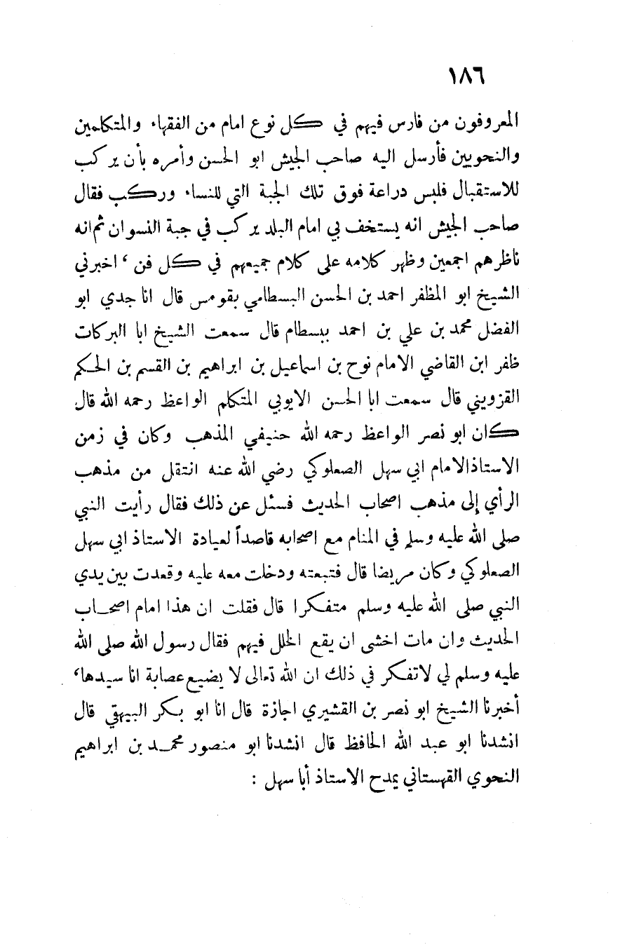 المعروفون من فَارس فيهم فِي كل نوع إِمَام من الْفُقَهَاء والمتكلمين والنحويين فَأرْسل إِلَيْهِ صَاحب الْجَيْش أَبُو الْحَسَنِ وَأمره بِأَن يركب للاستقبال فَلبس دراعة فَوق تِلْكَ الْجُبَّة الَّتِي للنِّسَاء وَركب فَقَالَ صَاحب الْجَيْش إِنَّه يستخف بِي إِمَام الْبَلَد يركب فِي جُبَّة النسوان ثمَّ إِنَّه نَاظرهم أَجْمَعِينَ وَظهر كَلَامه على كَلَام جَمِيعهم فِي كل فن أَخْبَرنِي الشَّيْخُ أَبُو الْمُظَفَّرِ أَحْمَدُ بْنُ الْحسن البسطامي بقومس قَالَ أَنا جدي أَبُو الْفَضْلِ مُحَمَّدُ بْنُ عَلِيِّ بْنِ أَحْمَدَ ببسطام قَالَ سَمِعت الشَّيْخ أَبَا البركات ظفر بن الْقَاضِي الإِمَام نوح بن إِسْمَاعِيل بن إِبْرَاهِيم بن الْقسم بن الحكم الْقزْوِينِي قَالَ سَمِعت أَبَا الْحسن الأيوبي الْمُتَكَلّم الْوَاعِظ رَحمَه اللَّه قَالَ كَانَ أَبُو نصر الْوَاعِظ رَحمَه اللَّه حنيفي الْمَذْهَب وَكَانَ فِي زمن الْأُسْتَاذ الإِمَام أَبِي سهل الصعلوكي رَضِيَ اللَّهُ عَنْهُ انْتقل من مَذْهَب الرَّأْي إِلَى مَذْهَب أَصْحَاب الحَدِيث فَسئلَ عَن ذَلِك فَقَالَ رَأَيْت النَّبِي صَلَّى اللَّهُ عَلَيْهِ وَسَلَّمَ فِي المنَام مَعَ أَصْحَابه قَاصِدا لعبادة الْأُسْتَاذ أَبِي سهل الصعلوكي وَكَانَ مَرِيضا قَالَ فتتبعته وَدخلت مَعَه عَلَيْهِ وَقَعَدت بَين يَدي النَّبِي صَلَّى اللَّهُ عَلَيْهِ وَسَلَّمَ متفكرا قَالَ فَقلت إِن هَذَا إِمَام أَصْحَاب الحَدِيث وَإِن مَاتَ أخْشَى أَن يَقع الْخلَل فيهم فَقَالَ رَسُول اللَّه صَلَّى اللَّهُ عَلَيْهِ وَسَلَّمَ لي لَا تفكر فِي ذَلِك إِن اللَّه تَعَالَى لَا يضيع عِصَابَة أنَا سَيِّدهَا أَخْبَرَنَا الشَّيْخُ أَبُو نصر بن الْقشيرِي اجازة قَالَ أَنا أَبُو بكر الْبَيْهَقِيّ قَالَ أنشدنَا أَبُو عَبْدِ اللَّهِ الْحَافِظ قَالَ أنشدنَا أَبُو مَنْصُور مُحَمَّد بن إِبْرَاهِيمَ النَّحْوِيّ الْقُهسْتَانِيّ يمدح الْأُسْتَاذ أَبَا سهل