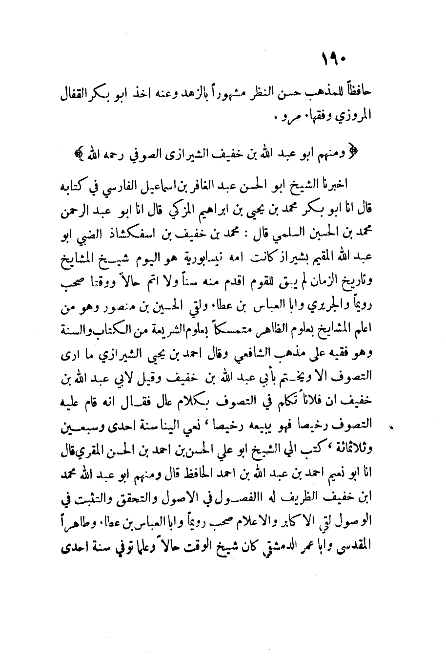 أَخْبَرَنَا الشَّيْخُ أَبُو الْحَسَنِ عبد الغافر بن إِسْمَاعِيلَ الْفَارِسِي فِي كِتَابه قَالَ أَنا أَبُو بَكْرٍ مُحَمَّدُ بْنُ يَحْيَى بن إِبْرَاهِيم الْمُزَكي قَالَ أَنا أَبُو عَبْدِ الرَّحْمَنِ مُحَمَّدُ بْنُ الْحُسَيْنِ السّلمِيّ قَالَ مُحَمَّد بن خَفِيف بن أسفكشاذ الضَّبِّيّ أَبُو عَبْد اللَّهِ الْمُقِيم بشيراز كَانَت أمه نيسابورية هُوَ الْيَوْم شيخ الْمَشَايِخ وتاريخ الزَّمَان لم يبْق للْقَوْم أقدم مِنْهُ سنَا وَلَا أتم حَالا ووقتا صحب رويما والجريري وَأَبا الْعَبَّاس بن عَطاء وَلَقي الْحُسَيْن بن مَنْصُور وَهُوَ من أعلم الْمَشَايِخ بعلوم الظَّاهِر متمسكا بعلوم الشَّرِيعَة من الْكتاب وَالسّنة وَهُوَ فَقِيه على مَذْهَب الشَّافِعِي وَقَالَ أَحْمد بن يَحْيَى الشِّيرَازِيّ مَا أرى التصوف إِلَّا وَيخْتم بِأبي عَبْد اللَّهِ بن خَفِيف وَقيل لأبي عَبْد اللَّهِ بن خَفِيف إِن فلانَا تكلم فِي التصوف بِكَلَام عَال فَقَالَ إِنَّه قَامَ عَلَيْهِ التصوف رخيصا فَهُوَ يَبِيعهُ رخيصا نعي إلينَا سنة إِحْدَى وَسبعين وثلاثمائة كتب إِلَيّ الشَّيْخ أَبُو عَلِيٍّ الْحَسَنُ بْنُ أَحْمَدَ بْنِ الْحَسَنِ الْمقري قَالَ أَنا أَبُو نُعَيْمٍ أَحْمَدُ بْنُ عَبْدِ اللَّهِ بْنِ أَحْمَدَ الْحَافِظ قَالَ وَمِنْهُم أَبُو عَبْدِ اللَّهِ مُحَمَّدُ ابْن خَفِيف الظريف لَهُ الْفُصُول فِي الْأُصُول وَالتَّحْقِيق والتثبت فِي الْوُصُول لَقِي الأكابر والأعلام صحب رويما وَأَبا الْعَبَّاس بن عَطاء وطاهرا الْمَقْدِسِي وَأَبا عمر الدِّمَشْقِي كَانَ شيخ الْوَقْت حَالا وعلما توفّي سنة إِحْدَى