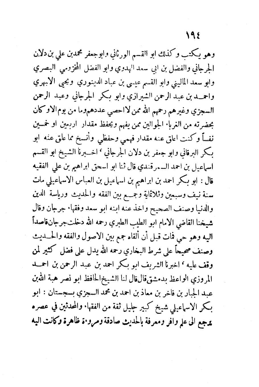وَهُوَ يكْتب وَكَذَلِكَ أَبُو الْقسم الورثاني وأَبُو جَعْفَر مُحَمَّد بن عَلِيِّ بْنِ دلان الْجِرْجَانِيّ وَالْفضل بن أَبِي سعد الهدوي وأَبُو الْفضل المَخْزُومِي الْبَصْرِيّ وأَبُو سعد الْمَالِينِي وَأَبُو الْقسم عِيسَى بن عباد الدينَوَرِي ويَحْيَى الْأَبْهَرِيّ وَأحمد بن عَبْدِ الرَّحْمَنِ الشِّيرَازِيّ وأَبُو بكر الْجِرْجَانِيّ وعَبْد الرَّحْمَنِ السجْزِي وَغَيرهم رَحِمهم اللَّه مِمَّن لَا أحصي عَددهمْ وَمَا من يَوْم إِلَّا وَكَانَ بِحَضْرَتِهِ من الغرباء الجوالين مِمَّن يفهم ويحفظ مِقْدَار أَرْبَعِينَ أَو خمسين نفسا وَكنت أعلق عَنهُ مِقْدَار فهمي وحفظي وأنسخ مِمَّا علق عَنهُ أَبُو بكر البرقاني وأَبُو جَعْفَر بن دلان الْجِرْجَانِيّ أَخْبَرَنَا الشَّيْخ أَبُو الْقسم إِسْماعِيلُ بْنُ أَحْمَدَ السَّمرقَنْدِي قَالَ ثَنَا أَبُو اسحق إِبْرَاهِيم بن عَليّ الْفَقِيه قَالَ أَبُو بَكْرٍ أَحْمَدُ بْنُ إِبْرَاهِيمَ بن إِسْمَاعِيلَ بن الْعَبَّاسِ الْإِسْمَاعِيلِيّ مَاتَ سنة نَيف وَسبعين وثلاثمائة وَجمع بَين الْفِقْه والْحَدِيث ورياسة الدّين وَالدُّنْيَا وصنف الصَّحِيح وَأخذ عَنهُ ابْنه أَبُو سعد وفقهاء جرجان وَقَالَ شيخنَا الْقَاضِي الإِمَام أَبُو الطّيب الطَّبَرِيّ رَحمَه اللَّه دخلت جرجان قَاصِدا إِلَيْهِ وَهُوَ حَيّ فَمَاتَ قبل أَن أَلْقَاهُ جمع بَين الْأُصُول وَالْفِقْه والْحَدِيث وصنف صَحِيحا على شَرط البُخَارِيّ رَحمَه اللَّه يدل على فضل كثير لمن وقف عَلَيْهِ أَخْبَرَنَا الشريف أَبُو بَكْرٍ أَحْمَدُ بْنُ عبد الرَّحْمَن بن أَحْمد المرزوي الْوَاعِظ بِدِمَشْقَ قَالَ قَالَ لنَا الشَّيْخ الْحَافِظ أَبُو نصر هِبَة اللَّهِ بن عَبْدِ الْجَبَّارِ بن فاخر بن معَاذ بن أَحْمَدَ بْنِ مُحَمَّد السجْزِي بسجستان أَبُو بكر الْإِسْمَاعِيلِيّ شيخ كَبِير جليل ثِقَة من الْفُقَهَاء والمحدثين فِي عصره يرجع إِلَى علم وافر وَمَعْرِفَة بِالْحَدِيثِ صَادِقَة ومروءة ظَاهِرَة وَكَانَت إِلَيْهِ