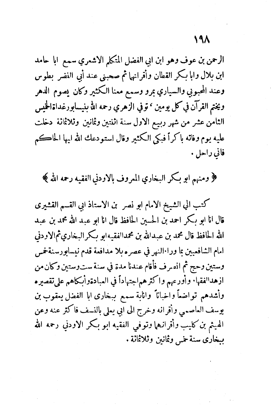 الرَّحْمَنِ بن عَوْف وَهُوَ ابْن أَبِي الْفضل الْمُتَكَلّم الْأَشْعَرِيّ سمع أَبَا حَامِد ابْن بِلَال وَأَبا بكر الْقطَّان وأقرانهما ثمَّ صحبَنِي عِنْد أَبِي النَّضر بطوس وَعند المحبوبي والسياري بمرو وَسمع معنَا الْكثير وَكَانَ يَصُوم الدَّهْر وَيخْتم الْقُرْآن فِي كل يَوْمَيْنِ توفّي الزُّهْرِيّ رَحمَه اللَّه بِنَيْسَابُورَ غَدَاة الْخَمِيس الثَّامِن عشر من شهر ربيع الأول سنة اثْنَتَيْنِ وَثَمَانِينَ وثلاثمائة دخلت عَلَيْهِ يَوْم وَفَاته باكرا فَبكى الْكثير وَقَالَ أستودعك اللَّه أَيهَا الْحَاكِم فَإِنِّي راحل
