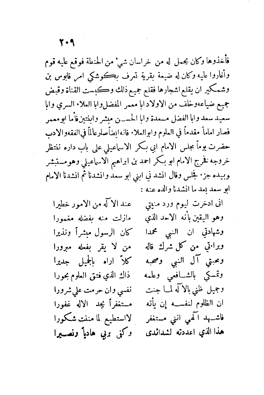 فَأَخَذُوهَا وَكَانَ يحمل لَهُ من خُرَاسَان شَيْء من الْحِنْطَة فَوَقع عَلَيْهِ قوم وأغاروا عَلَيْهِ وَكَانَ لَهُ ضَيْعَة بقرية تعرف بكوشكي أَمر قَابُوس بن وشمكير أَن يقْلع أشجارها فَقلع جَمِيع ذَلِك وكبست القنَاة وَقبض جَمِيع ضيَاعه وَخلف من الْأَوْلَاد أَبَا معمر الْمفضل وَأَبا الْعَلَاء السّري وَأَبا سعيد سعد وَأَبا الْفضل مسْعدَة وَأَبا الْحسن مُبشر وابنتين فَأَما أَبُو معمر فَصَارَ إِمَامًا مقدما فِي الْعُلُوم وأَبُو الْعَلَاء فَإِنَّهُ أَيْضا صَار عَالما فِي الْفِقْه وَالْأَدب حضرت يَوْمًا مجْلِس الإِمَام أَبِي بكر الْإِسْمَاعِيلِيّ على بَاب دَاره نَنْتَظِر خُرُوجه فَخرج الإِمَام أَبُو بَكْرٍ أَحْمَدُ بْنُ إِبْرَاهِيمَ الْإِسْمَاعِيلِيّ وَهُوَ مُسْتَبْشِرٍ وَبِيَدِهِ جُزْء فَجَلَسَ وَقَالَ أَنْشدني ابَنِي أَبُو سعد وأنشدنَا ثمَّ أنشدنَا الإِمَام أَبُو سعد بعد مَا أنشدنَا وَالِده عَنهُ ... إِنِّي ادخرت ليَوْم ورد منيتي ... عِنْد الْإِلَه من الْأُمُور خطيرا