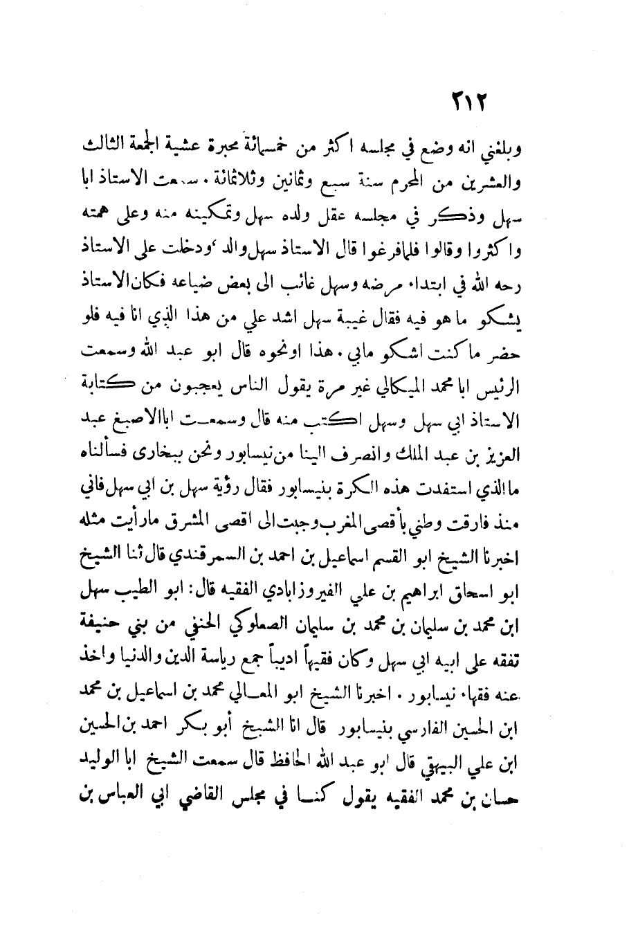 وَبَلغنِي أَنه وضع فِي مَجْلِسه أَكثر من خَمْسمِائَة محبرة عَشِيَّة الْجُمُعَة الثَّالِث وَالْعِشْرين من الْمحرم سنة سبع وَثَمَانِينَ وثلاثمائة سَمِعت الْأُسْتَاذ أَبَا سهل وَذكر فِي مَجْلِسه عقل وَلَده سهل وتمكينه مِنْهُ وعَلى همته وَأَكْثرُوا وقَالُوا فَلَمَّا فرغوا قَالَ الْأُسْتَاذ سهل وَالِد وَدخلت على الْأُسْتَاذ رَحمَه اللَّه فِي ابْتِدَاء مَرضه وَسَهل غَائِب إِلَى بعض ضيَاعه فَكَانَ الْأُسْتَاذ يشكو مَا هُوَ فِيهِ فَقَالَ غيبَة سهل أَشد عَليّ من هَذَا الَّذِي أنَا فِيهِ فَلَو حضر مَا كنت أَشْكُو مَا بِي هَذَا أَو نَحوه قَالَ أَبُو عَبْدِ اللَّهِ وَسمعت الرئيس أَبَا مُحَمَّد الميكالي غير مرّة يَقُول النَّاس يعْجبُونَ من كِتَابَة الْأُسْتَاذ أَبِي سهل وَسَهل أكتب مِنْهُ قَالَ وَسمعت أَبَا الْأَصْبَغ عبد الْعَزِيز بن عبد الْملك وَانْصَرف إلينَا من نيسابور وَنحن ببخارى فسألنَاه مَا الَّذِي اسْتَفَدْت هَذِهِ الكرة بِنَيْسَابُورَ فَقَالَ رُؤْيَة سهل بن أَبِي سهل فَإِنِّي مُنْذُ فَارَقت وطني بأقصى الْمغرب وجُبتُ إِلَى أقْصَى الْمشرق مَا رَأَيْت مثله أخبرنَا الشَّيْخ أَبُو الْقسم إِسْمَاعِيلُ بْنُ أَحْمَدَ بْنِ السَّمَرْقَنْدِيِّ قَالَ ثَنَا الشَّيْخ أَبُو إِسْحَاق إِبْرَاهِيم بن عَليّ الفيروز ابادي الْفَقِيه قَالَ أَبُو الطّيب سهل ابْن مُحَمَّد بن سُلَيْمَان بن مُحَمَّدِ بْنِ سُلَيْمَان الصعلوكي الْحَنَفِيّ من بَنِي حنيفَة تفقه على أَبِيه أَبِي سهل وَكَانَ فَقِيها أديبا جمع رياسة الدّين وَالدُّنْيَا وَأخذ عَنهُ فُقَهَاء نيسابور أَخْبَرَنَا الشَّيْخُ أَبُو الْمَعَالِي مُحَمَّدُ بْنُ إِسْمَاعِيلَ بن مُحَمَّد ابْن الْحُسَيْن الْفَارِسِي بنيسابور قَالَ أَنا الشَّيْخ أَبُو بَكْرٍ أَحْمَدُ بْنُ الْحُسَيْن ابْن عَليّ الْبَيْهَقِيّ قَالَ أَبُو عَبْدِ اللَّهِ الْحَافِظ قَالَ سَمِعت الشَّيْخ أَبَا الْوَلِيد حسان بن مُحَمَّد الْفَقِيه يَقُول كنَّا فِي مجْلِس الْقَاضِي أَبِي الْعَبَّاس بن