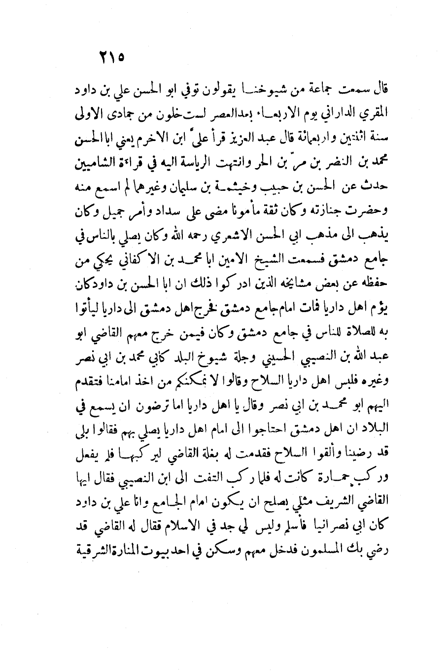 قَالَ سَمِعت جمَاعَة من شيوخنَا يَقُولُونَ توفّي أَبُو الْحَسَنِ عَلِيُّ بن دَاوُد الْمقري الدَّارَانِي يَوْم الْأَرْبَعَاء بعد الْعَصْر لست خلون من جُمَادَى الأولى سنة اثْنَتَيْنِ وَأَرْبَعمِائَة قَالَ عبد الْعَزِيزِ قَرَأَ عَليّ ابْن الأخرم يَعْنِي أَبَا الْحسن مُحَمَّد بن النَّضر بن مر بن الْحر وانتهت الرياسة إِلَيْهِ فِي قراءَة الشاميين حدث عَن حسن بن حبيب وخيثمة بن سُلَيْمَان وَغَيرهمَا لم أسمع مِنْهُ وَحَضَرت جنَازته وَكَانَ ثِقَة مَأْمُونا مضى على سداد وَأمر جميل وَكَانَ يذهب إِلَى مَذْهَب أَبِي الْحسن الْأَشْعَرِيّ رَحمَه اللَّه وَكَانَ يُصَلِّي بالنَّاس فِي جَامع دمشق فَسمِعت الشَّيْخ الْأمين أَبَا مُحَمَّد بن الْأَكْفَانِيِّ يَحْكِي من حفظه عَن بعض مشايخه الَّذين أدركوا ذَلِك أَن أَبَا الْحسن بن دَاوُد كَانَ يؤم أهل داريا فَمَاتَ إِمَام جَامع دمشق فَخرج أهل دمشق إِلَى داريا ليأتوا بِهِ للصَّلَاة للنَّاس فِي جَامع دمشق وَكَانَ فِيمَن خرج مَعَهم الْقَاضِي أَبُو عَبْدِ اللَّهِ بْنِ النصيبي الْحُسَيْنِي وَجلة شُيُوخ الْبَلَد كَأبي مُحَمَّد بن أَبِي نصر وَغَيره فَلبس أهل داريا السِّلَاح وقَالُوا لَا نمكنكم من أَخذ إمامنَا فَتقدم إِلَيْهِم أَبُو مُحَمَّد بن أَبِي نصر وَقَالَ ياأهل داريا أما ترْضونَ أَن يسمع فِي الْبِلَاد أَن أهل دمشق احتاجوا إِلَى إِمَام أهل داريا يُصَلِّي بهم فقَالُوا بلَى قد رضينَا وألقوا السِّلَاح فَقدمت لَهُ بغلة الْقَاضِي ليرْكبَهَا فَلم يفعل وَركب حمارة كَانَت لَهُ فَلَمَّا ركب الْتفت إِلَى ابْن النصيبي فَقَالَ أَيهَا الْقَاضِي الشريف مثلي يصلح أَن يكون إِمَام الْجَامِع وأنَا عَلِيُّ بْنُ دَاوُد كَانَ أَبِي نَصْرَانِيّا فَأسلم وَلَيْسَ لي جد فِي الْإِسْلَام فَقَالَ لَهُ الْقَاضِي قد رَضِي بك الْمُسلمُونَ فَدخل مَعَهم وَسكن فِي أحد بيُوت المنَارة الشرقية